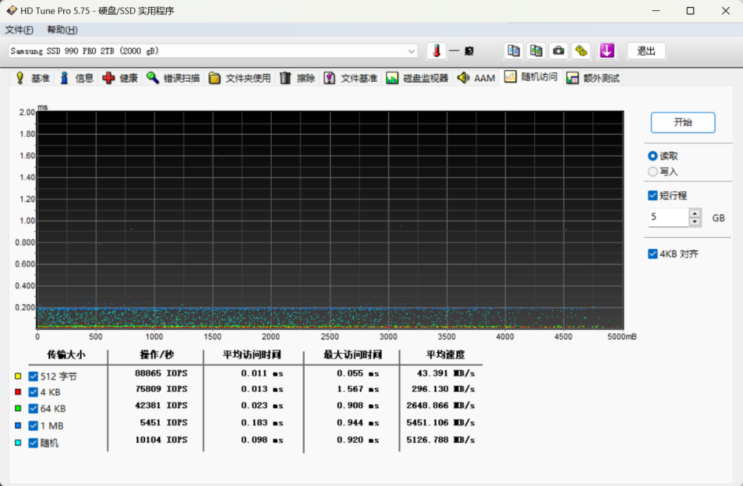 缓内访问延迟测试中 4KB 平均访问时间 0.013 ms 、随机平均访问时间0.09ms ,全程表现十分优秀,缓外成绩也同样稳定发挥。