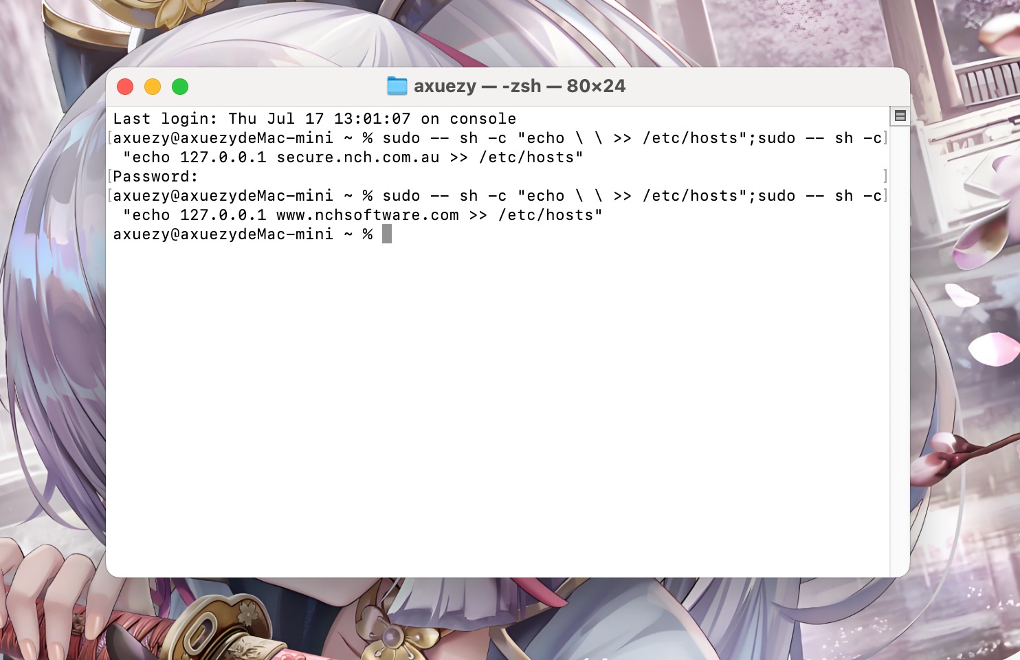 sudo — sh -c “echo \ \ >> /etc/hosts”;sudo — sh -c “echo 127.0.0.1 www.nchsoftware.com >> /etc/hosts”