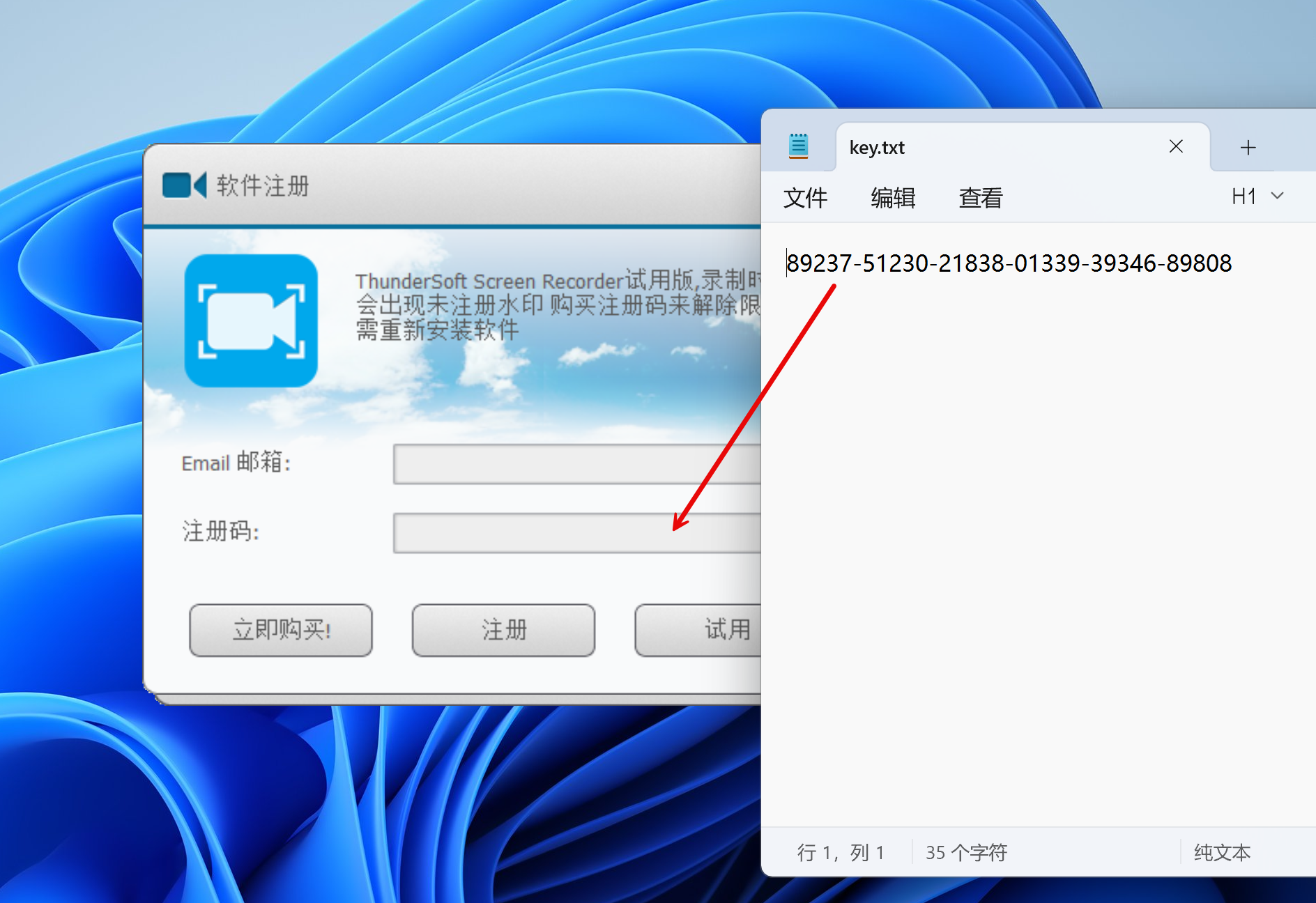 返回安装包,双击打开key.txt文件,运行软件,将注册码复制到注册信息内,输入任意邮箱