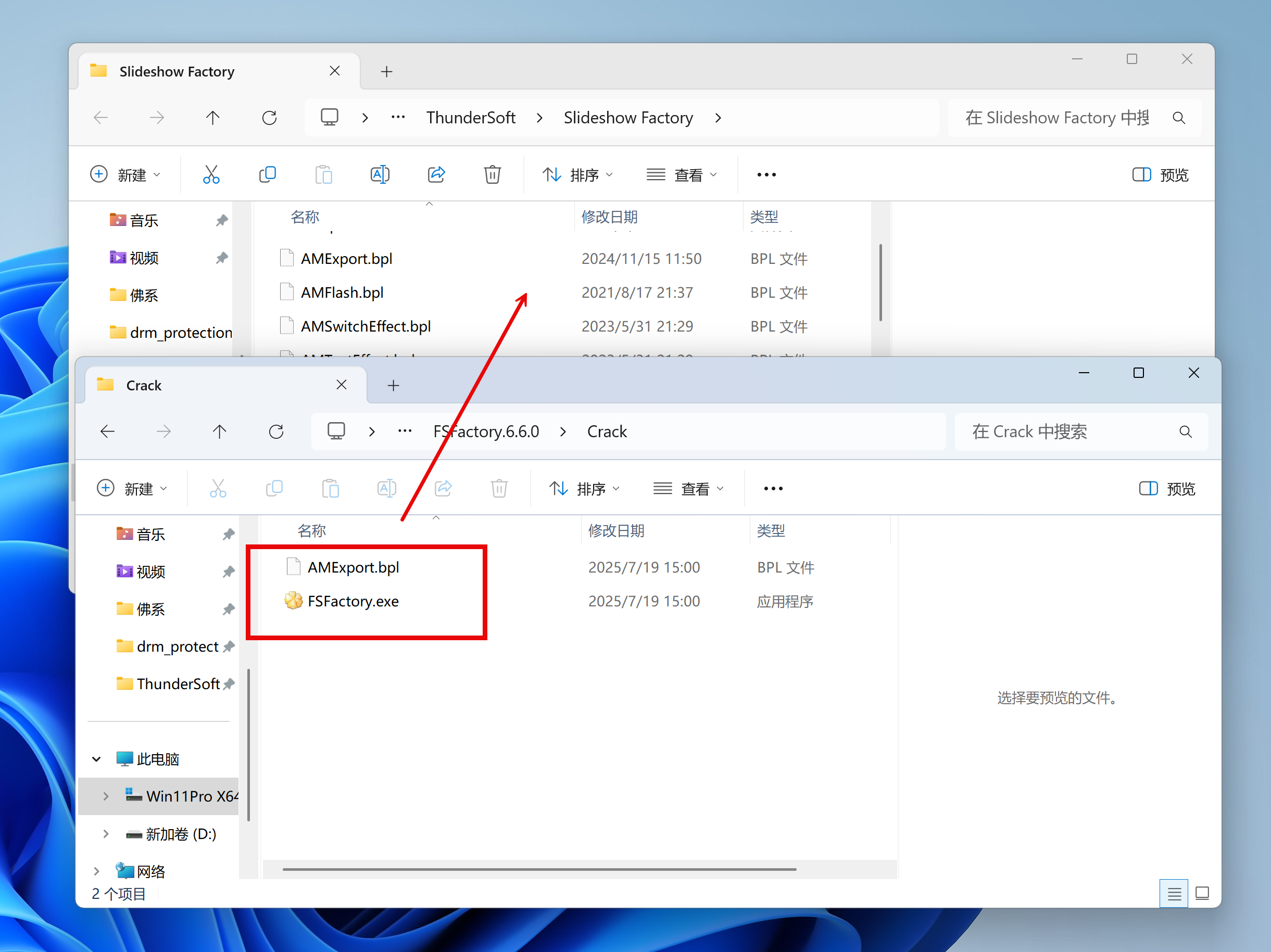 打开安装包中的”crack”文件夹,将破解补丁复制到安装目录下,并选择替换;默认目录为C:\Program Files (x86)\ThunderSoft\Slideshow Factory