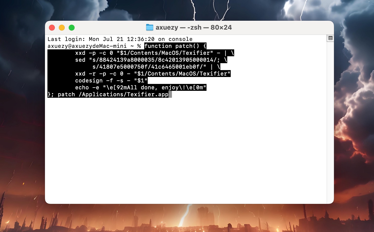 打开Texifier激活命令,并复制,打开终端软件,输入命令回车即可