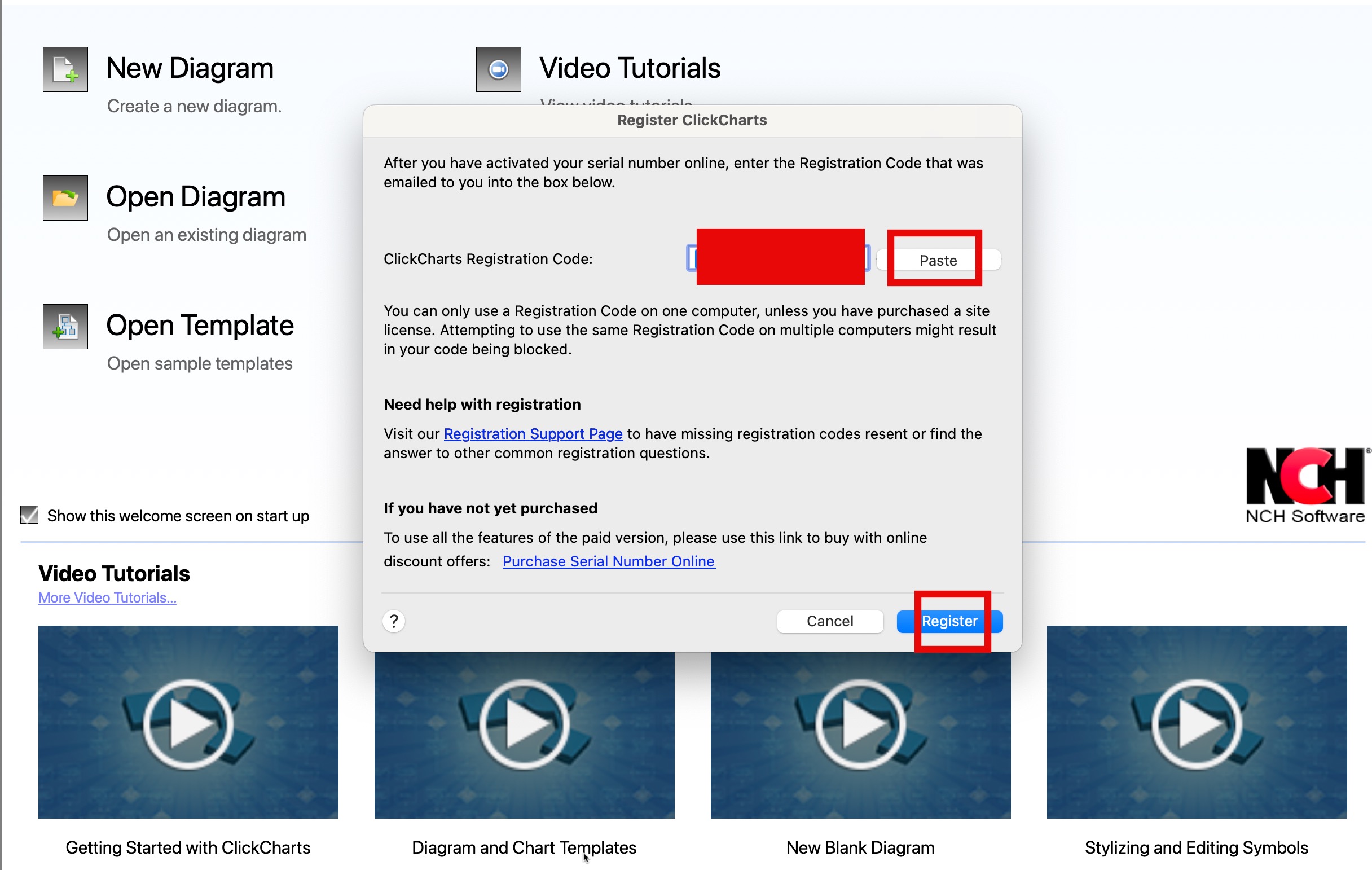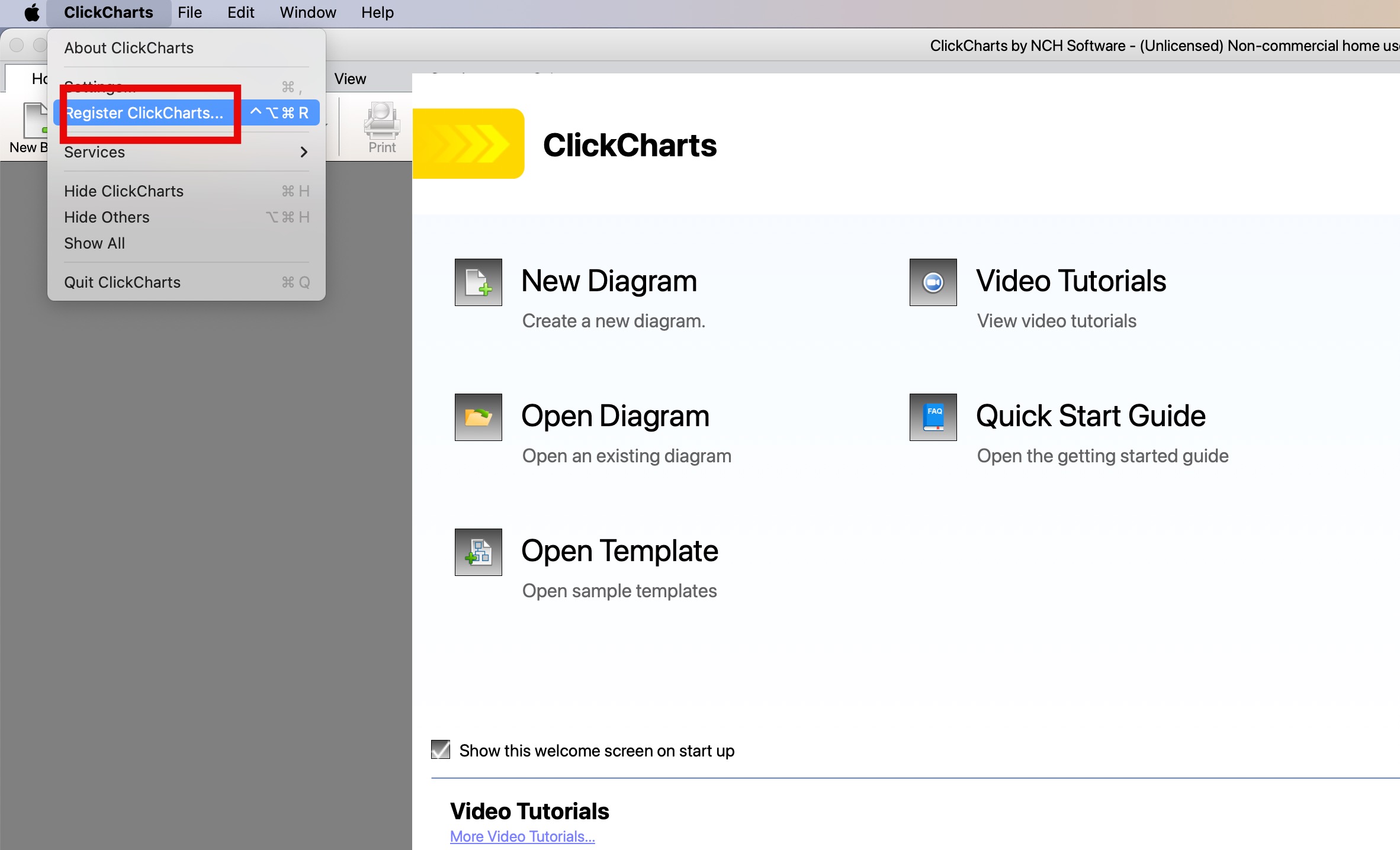 到应用程序,打开运行软件,点击Register ClickCharts…出现注册界面