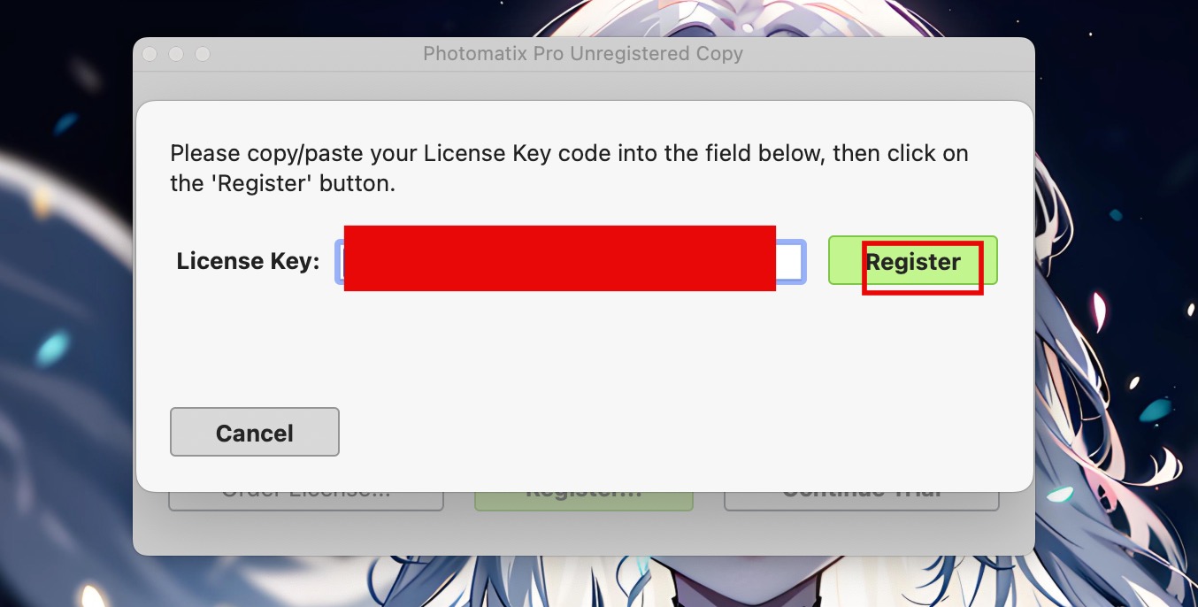 回到软件包,打开Photomatix Pro注册码,将HDRsoft Photomatix Pro注册码复制到注册页面,点击register