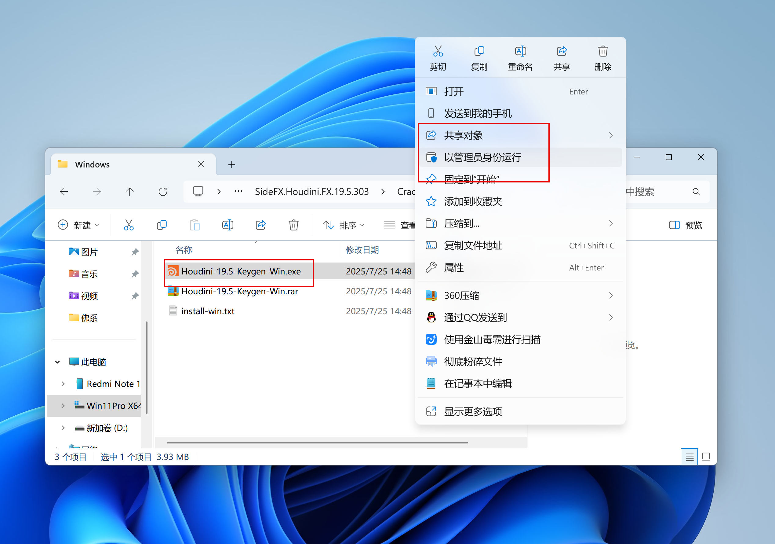 回到软件安装包,找到Houdini-19.5-Keygen-Win.exe鼠标右键用管理员身份运行