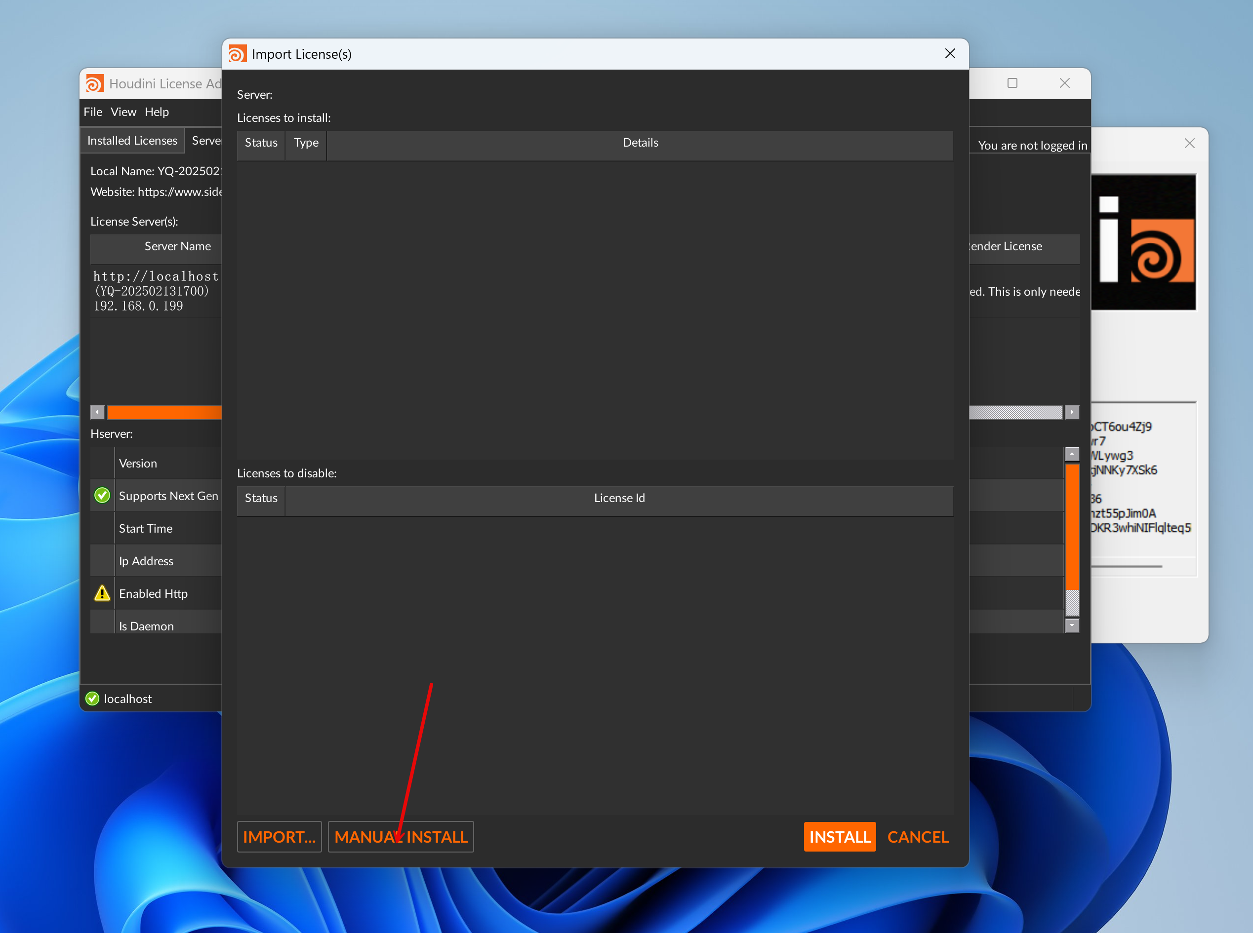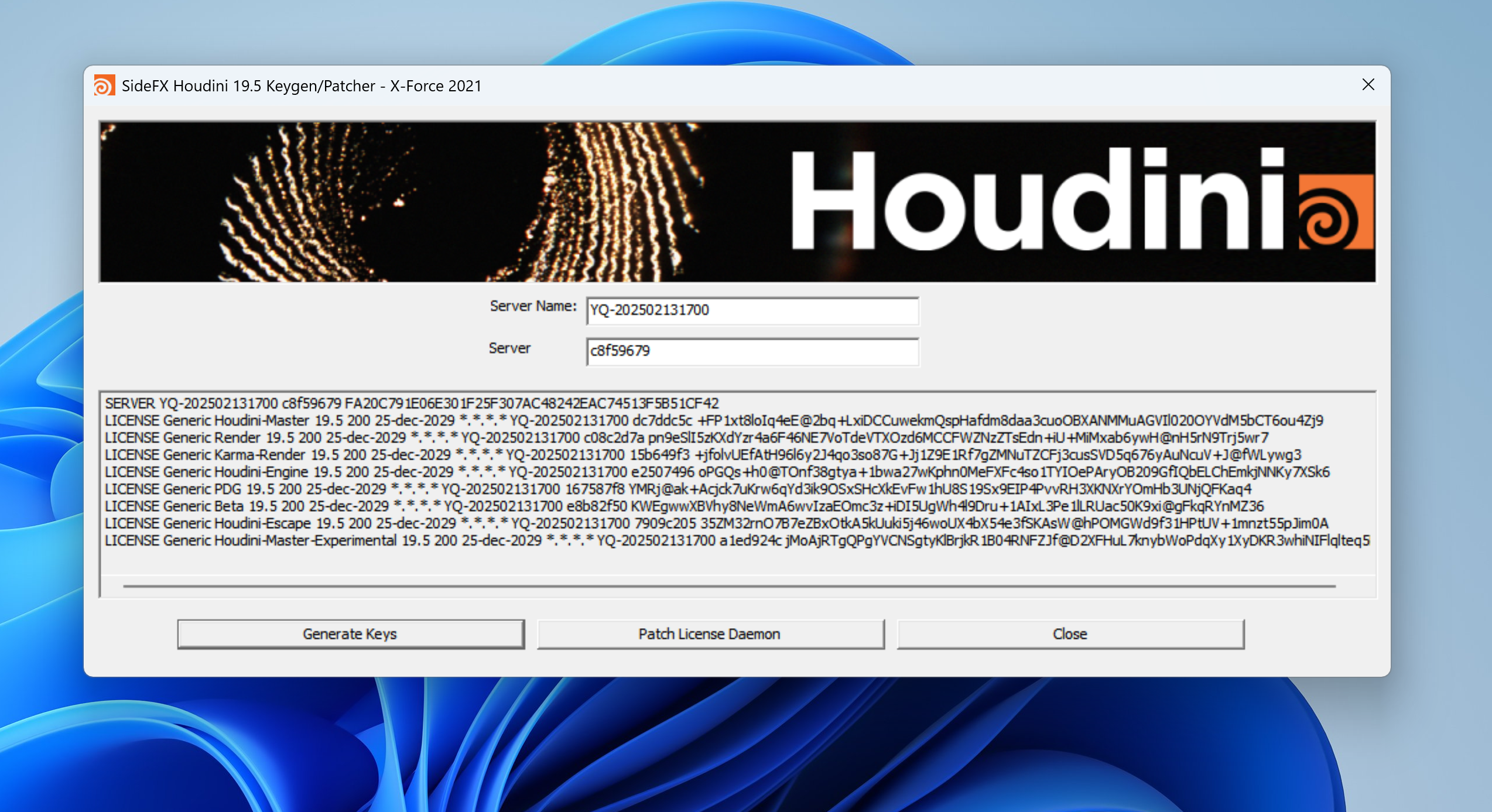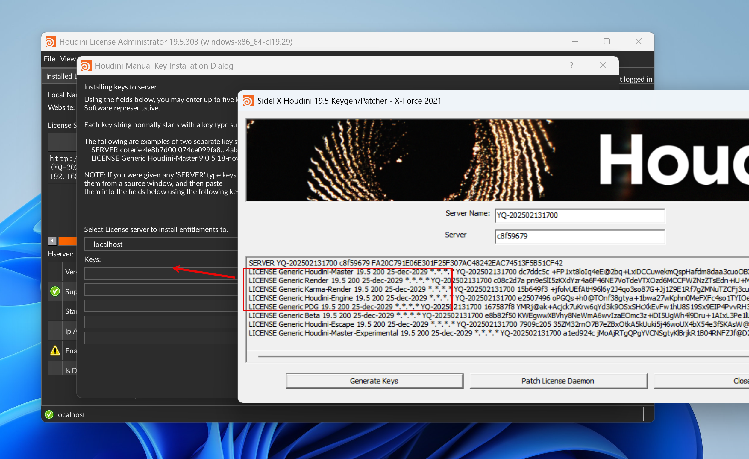将注册机里的前五组注册码复制Houdini Manual Key Installation Dialog的Keys里面,点击ACCEPT