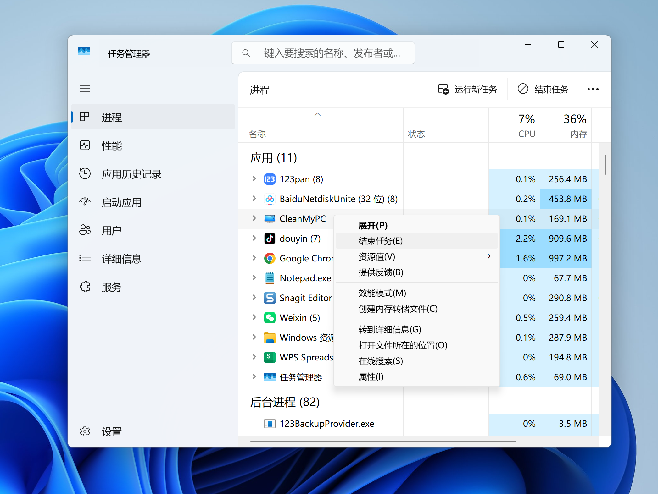 安装完成,打开任务管理器,在【进程】中找到【CleanMyPC Nt Service】并且结束进程。