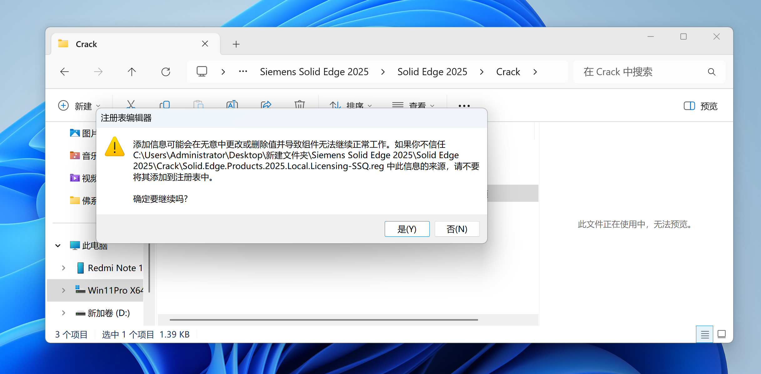 打开Crack文件夹,双击运行Solid.Edge.Products.2025.Local.Licensing-SSQ.reg,弹出对话框,点击是