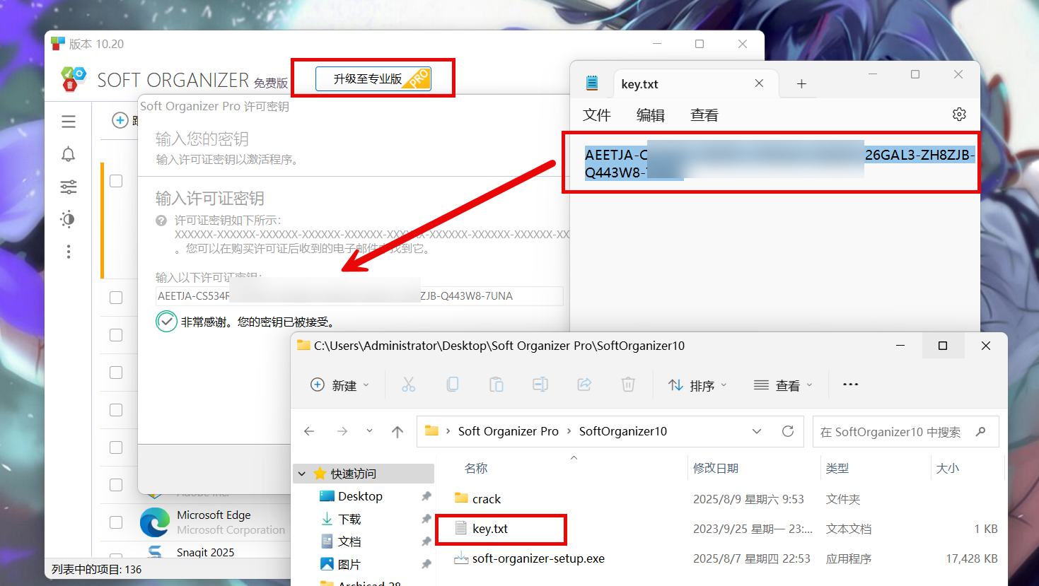 5、点击升级至专业版,将key.txt中的激活码,填入软件中。