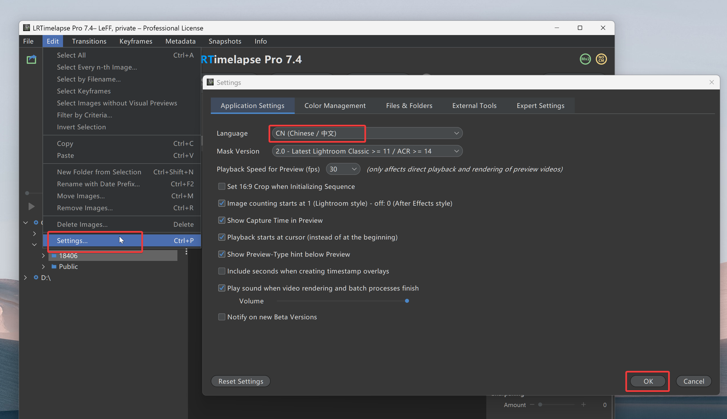 4、打开软件,依次点击 菜单栏 Edit→Settings→Application Settings→Language→CN(Chinese/中文)→OK→确定,重启后就是中文版了