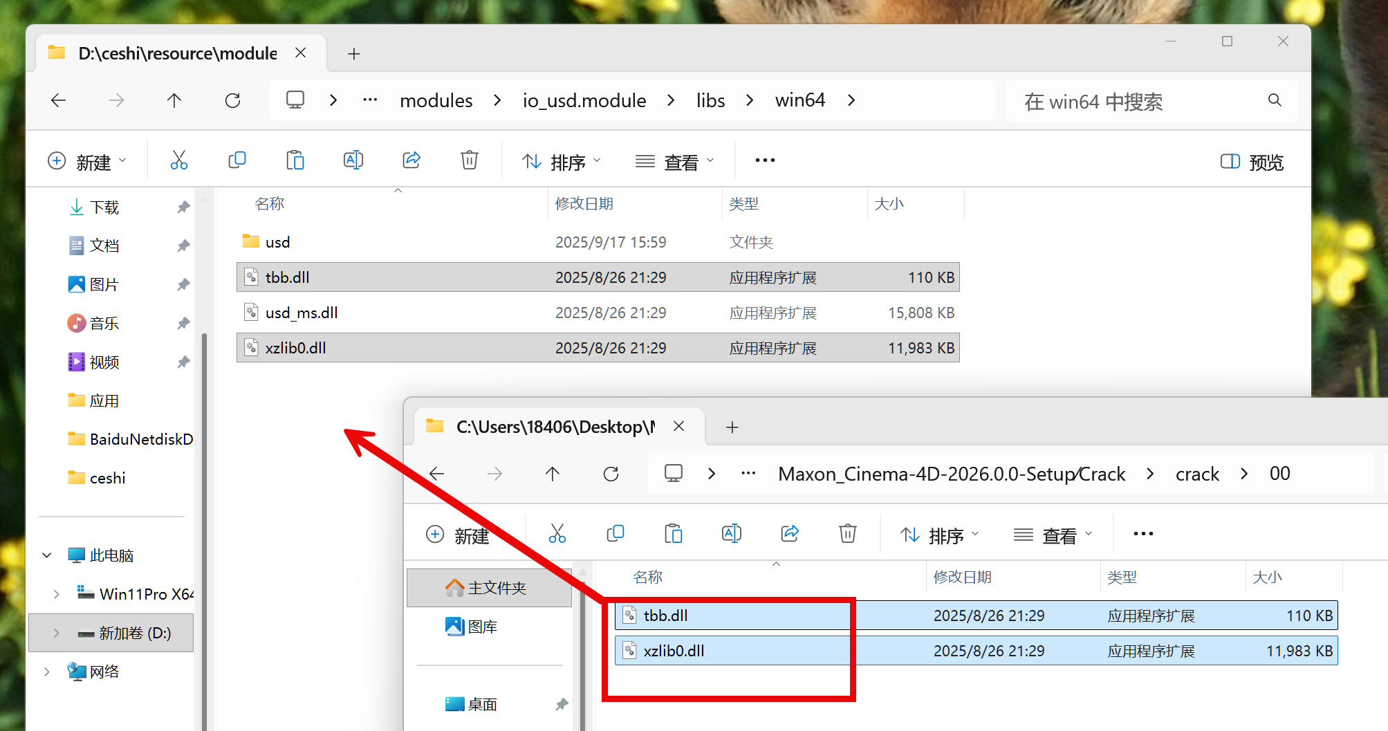 2、然后打开crack文件夹,将破解补丁复制到下面安装目录( → 无任何订阅用户:使用 00 文件夹内的 DLL → 有Redshift订阅:使用 01 文件夹内的 DLL ),