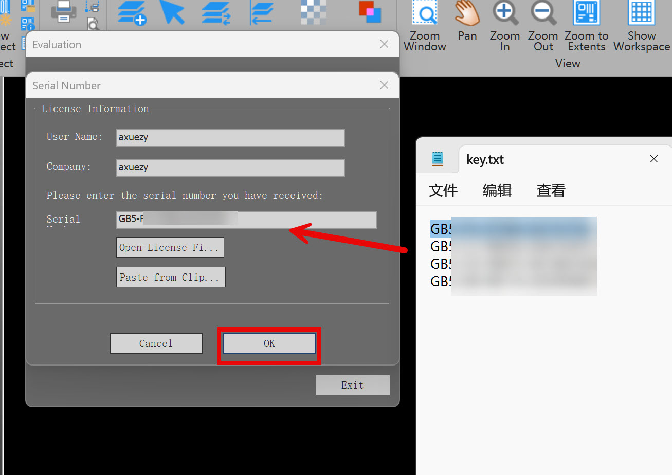 3、返回安装包,打开“key”文档,将任意一组注册码复制到对应框中,其余任意填写,点击“OK”