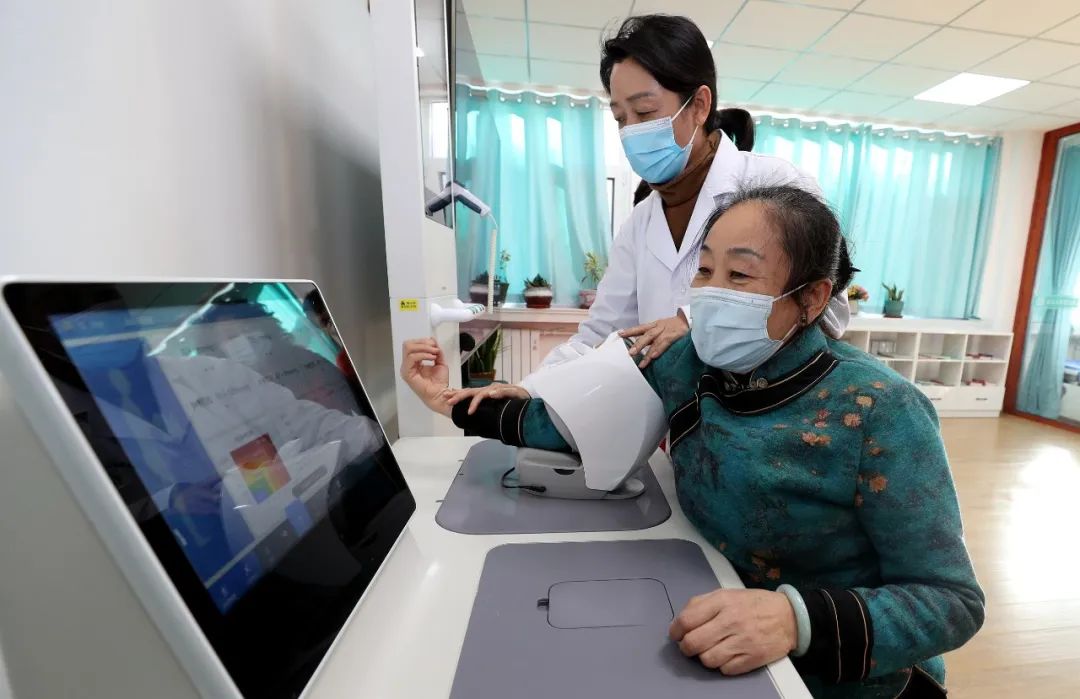 山东省东营市东营区黄河路街道玉景社区党群服务中心内,医护人员指导社区老人使用智能体检一体机自助查体。