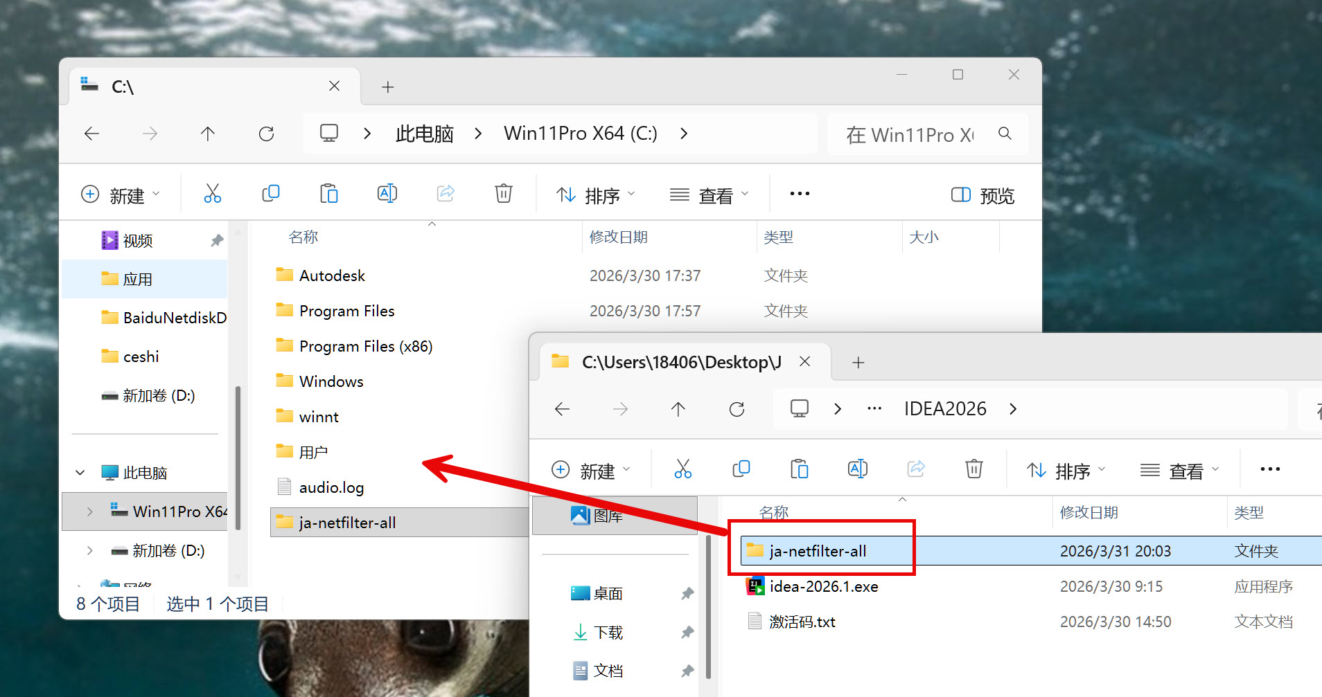 2、安装完成后将ja-netfilter-all文件夹放到指定位置(后期不要移动!),这里以放到C盘为例。