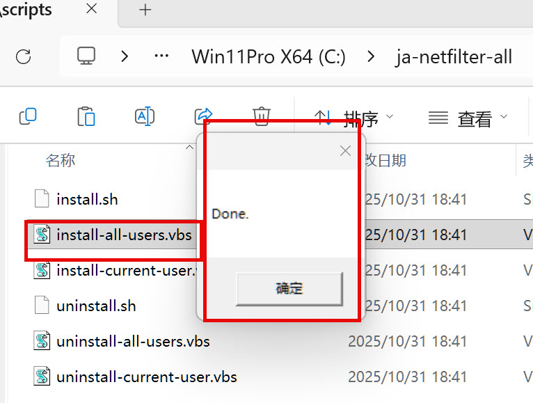 3、入ja-netfilter-all\scripts中运行install-all-users.vbs等出done点击确定。