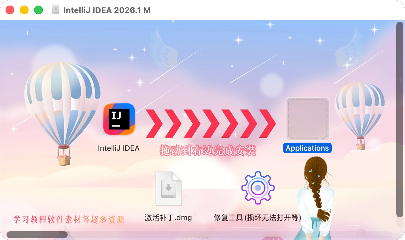 1、打开安装包,将左侧文件拖动到右侧文件夹,首次安装需要完成后打开一次软件。