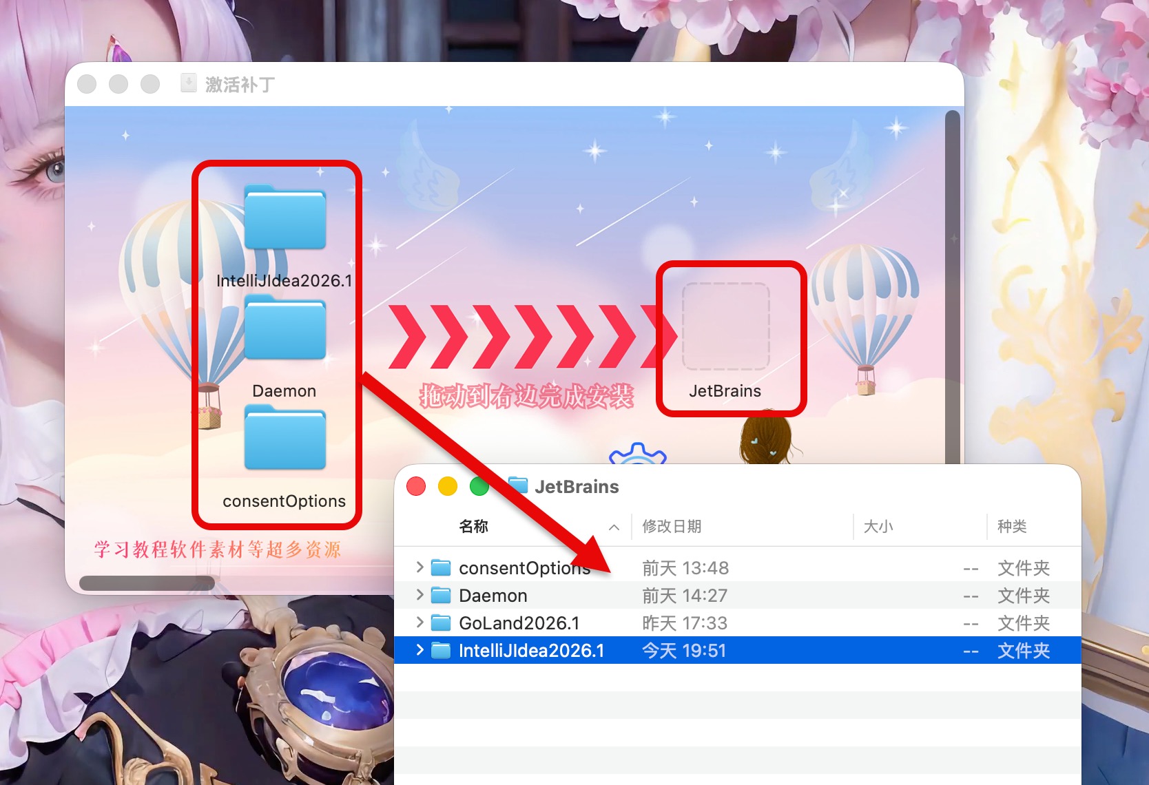 2、打开激活补丁,将左侧三个文件夹拖动到右侧文件夹中(双击右侧JetBrains打开文件夹)即可。