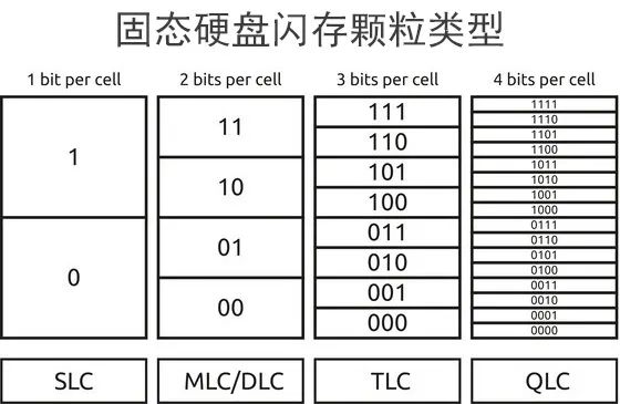 SSD 闪存颗粒按寿命从高到低、容量从低到高一般分为 SLC、MLC、TLC、QLC 等。