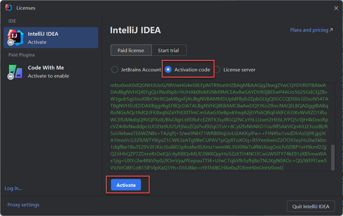 打开IntelliJ IDEA 2024软件,选择Activate paid license进入激活页面。将注册激活码复制到下图激活页面,击Activave即可激活使用。不用在意激活的时间,已经永久激活。