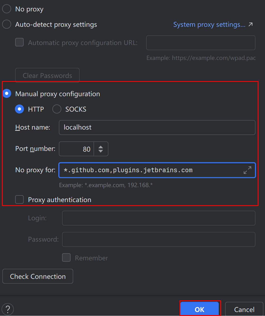 选择手动代理配置->HTTP,主机名localhost, 端口号80, 以下项目不用代理: *.github.com,plugins.jetbrains.com 确定