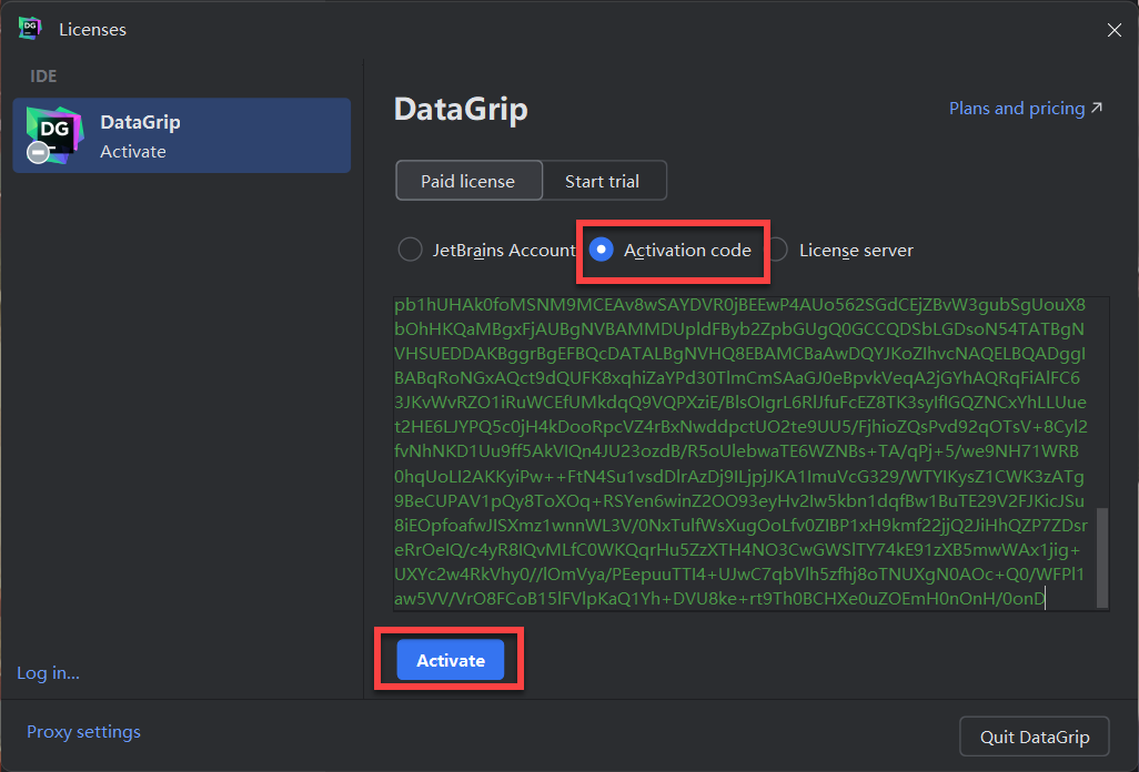 打开DataGrip 2024软件,点击Activate paid license进入激活页面。将注册激活码复制到下图激活页面,击Activave即可激活使用。不用在意激活的时间,已经永久激活。