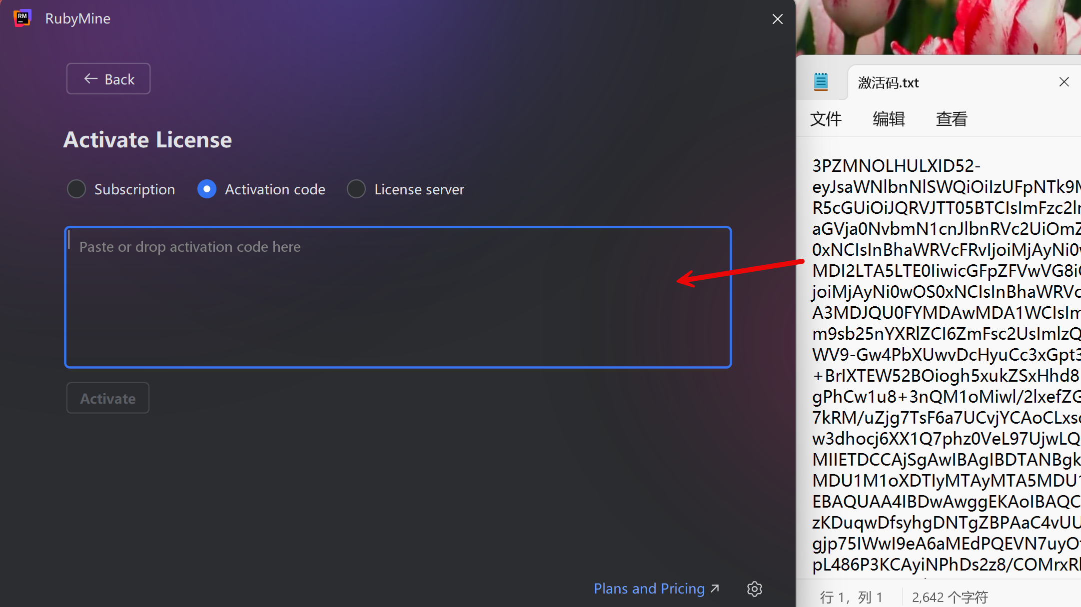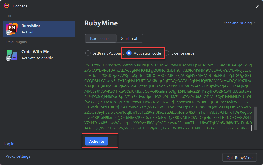打开RubyMine 2024软件,Activate paid license进入激活页面。将注册激活码复制到下图激活页面,击Activave即可激活使用。不用在意激活的时间,已经永久激活。