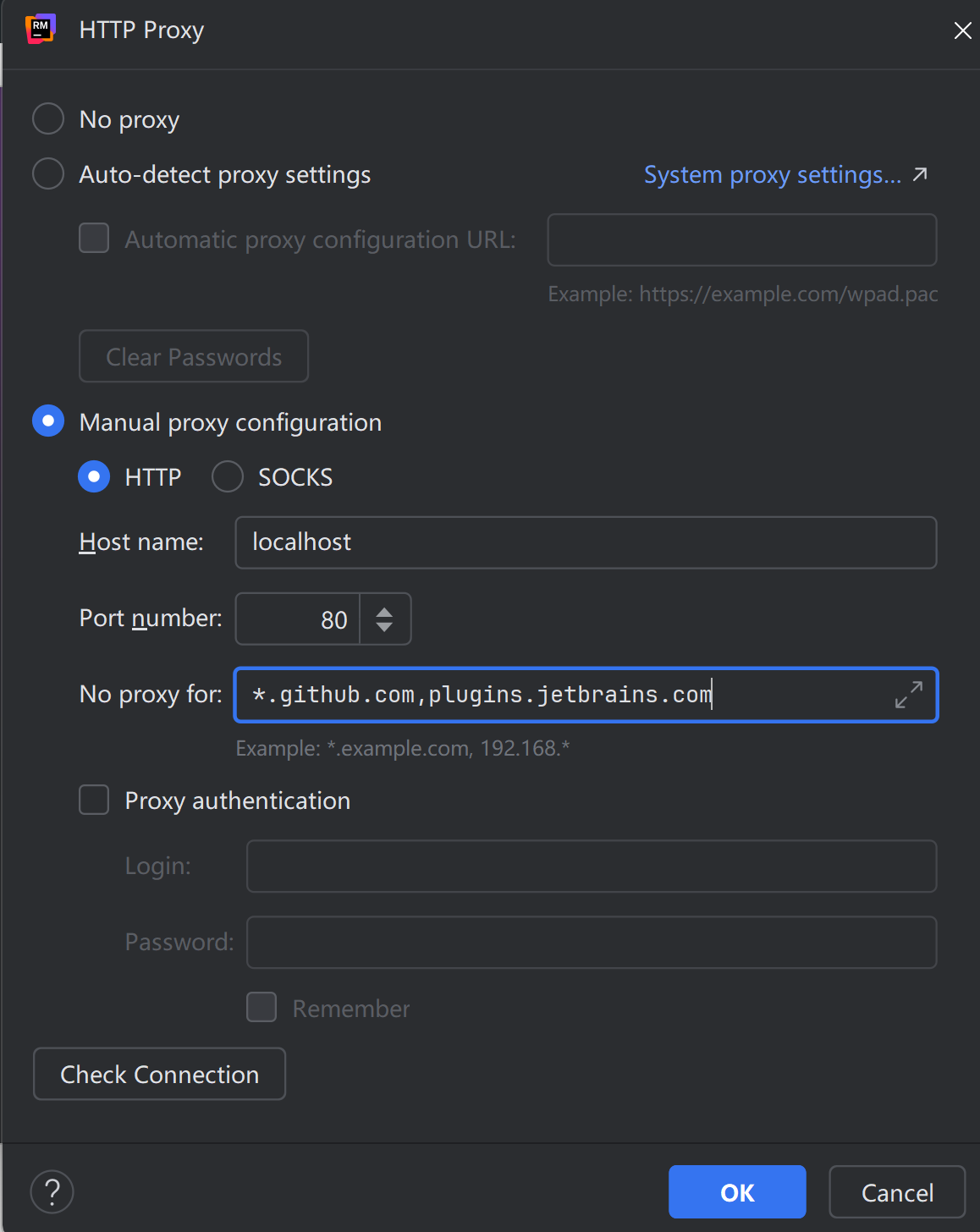 双击运行软件,点击设置,选择手动代理配置->HTTP,主机名localhost, 端口号80, 以下项目不用代理: *.github.com,plugins.jetbrains.com 确定