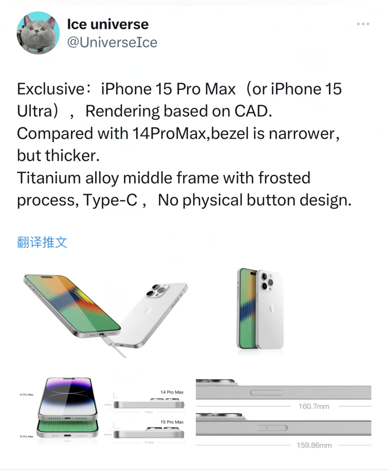 众所周知,虽然今年的iPhone 15系列在外观方面和去年iPhone 14系列应该大同小异,但在一些细节上还有会有所不同的。比如边框材质、机身的厚度、长度等等。