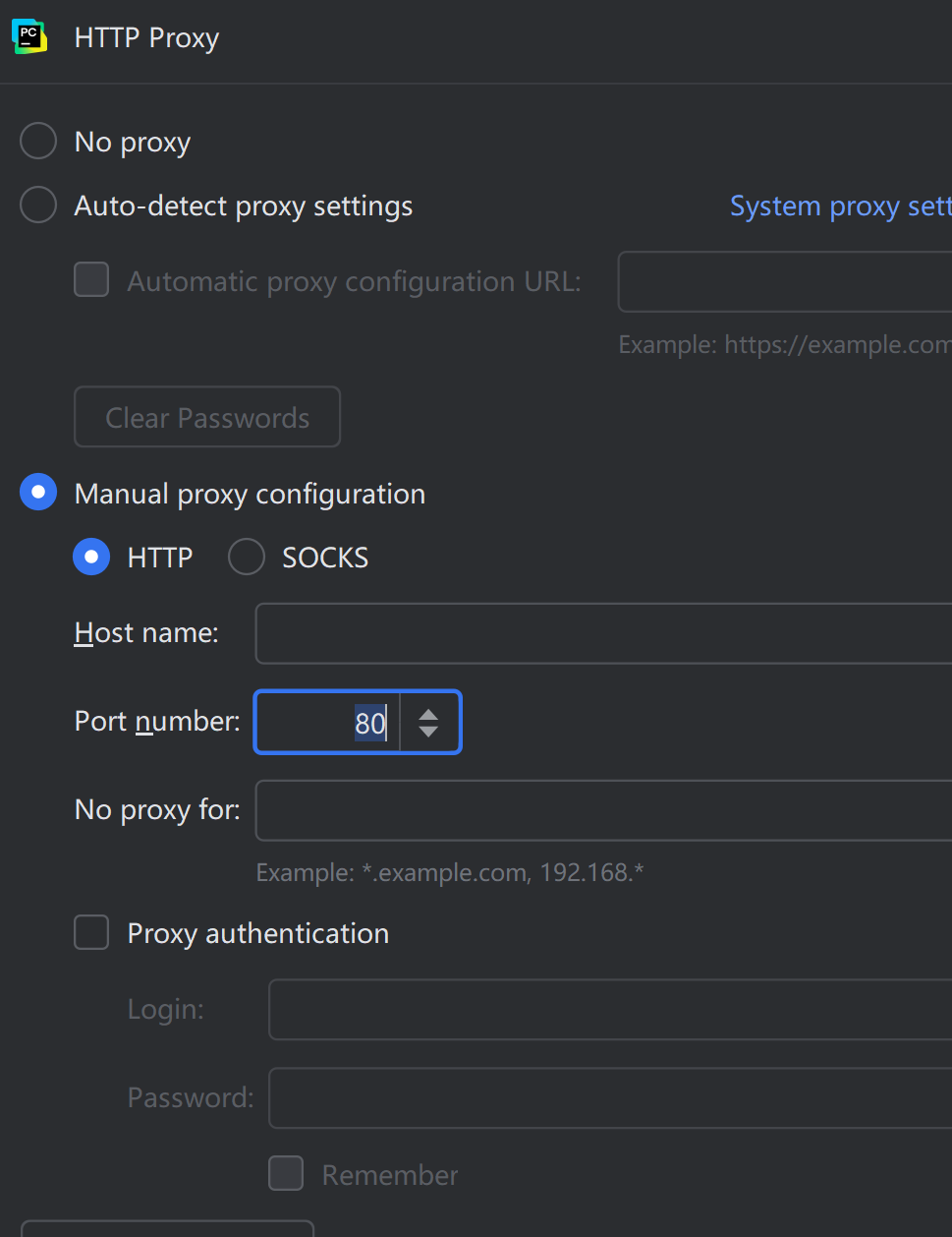 选择手动代理配置->HTTP,主机名localhost, 端口号80, 以下项目不用代理: *.github.com,plugins.jetbrains.com 确定