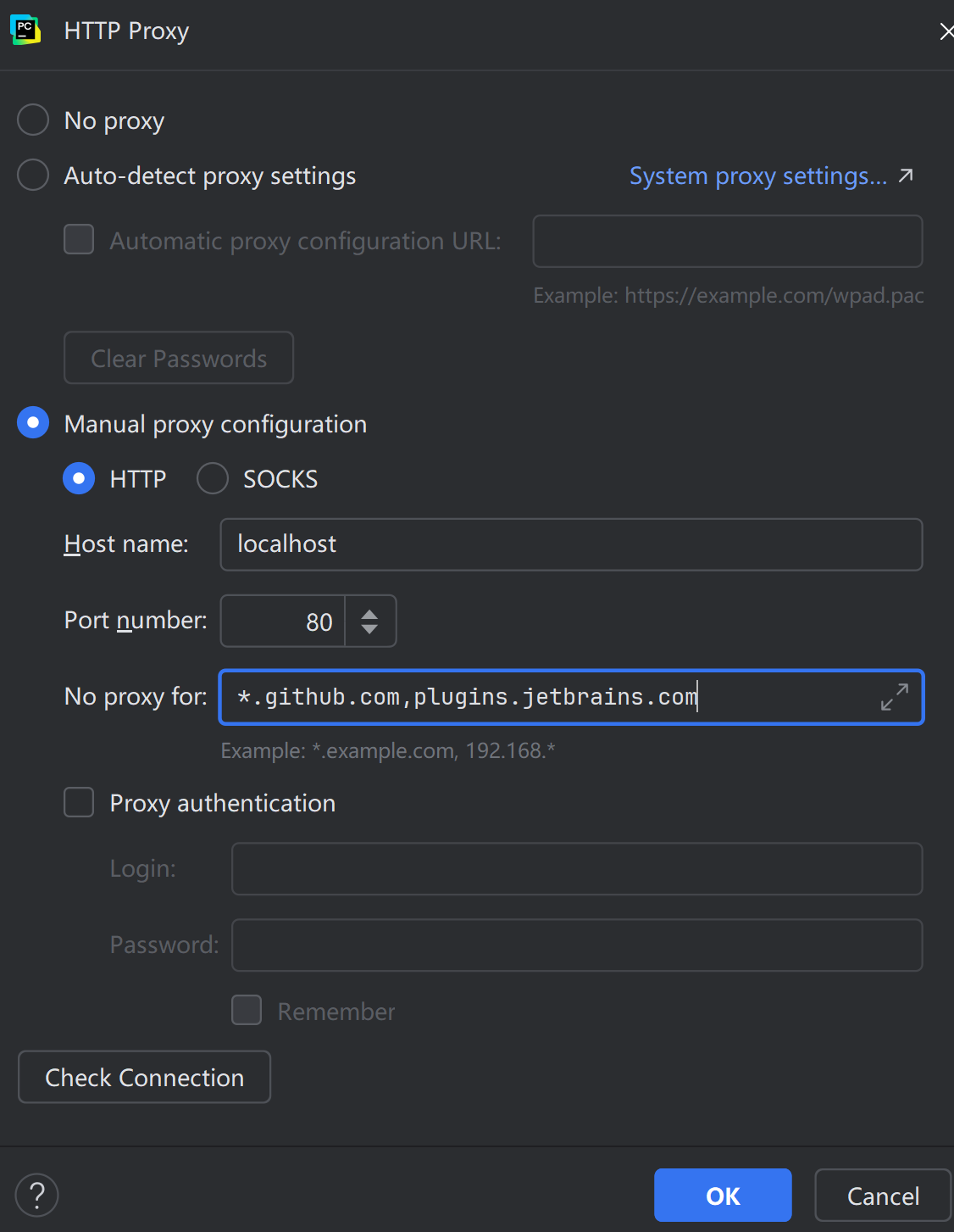 选择手动代理配置->HTTP,主机名localhost, 端口号80, 以下项目不用代理: *.github.com,plugins.jetbrains.com 确定
