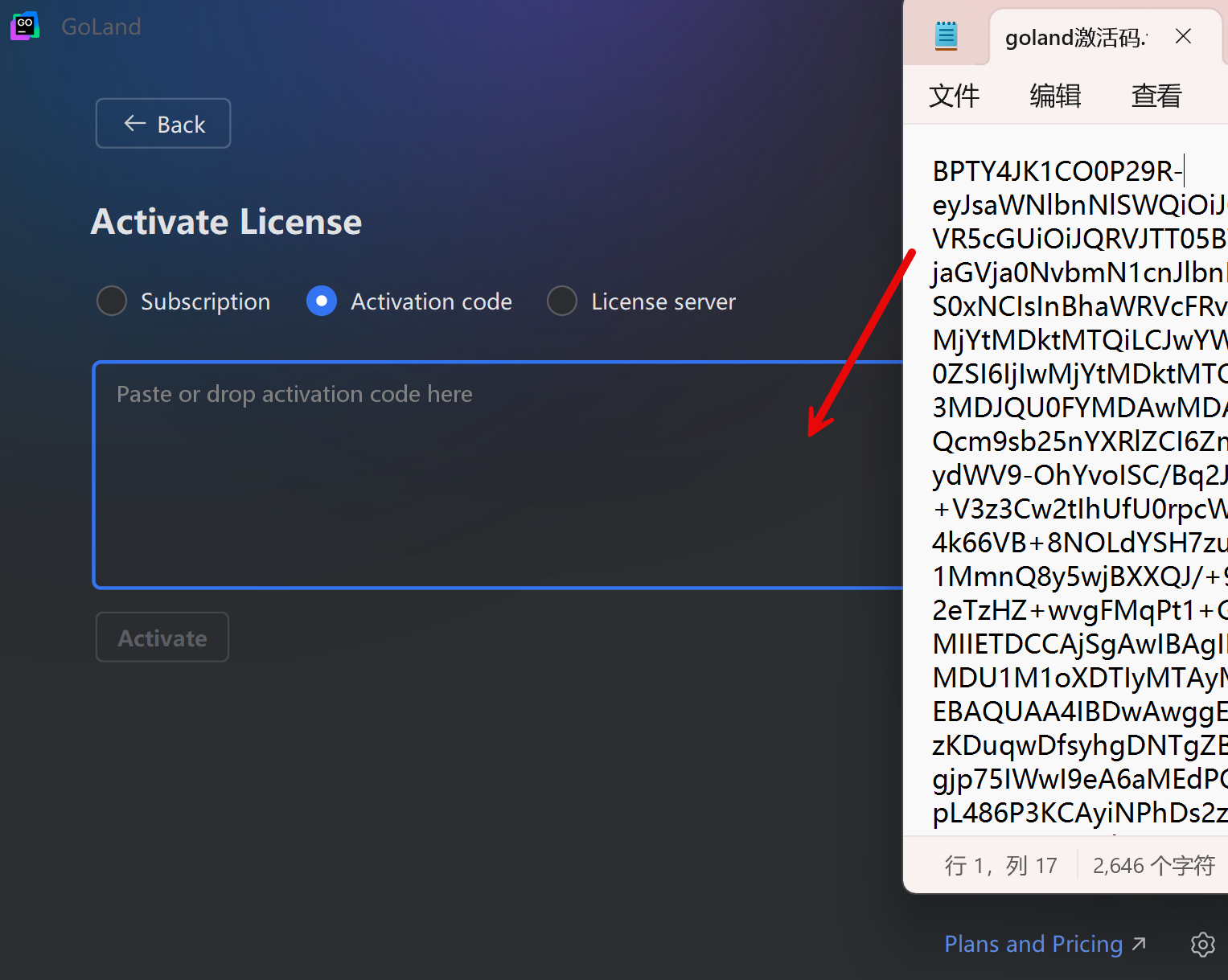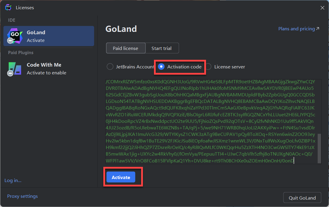 打开GoLand 2024软件,点Activate paid license进入激活页面。将注册激活码复制到下图激活页面,击Activave即可激活使用。不用在意激活的时间,已经永久激活。