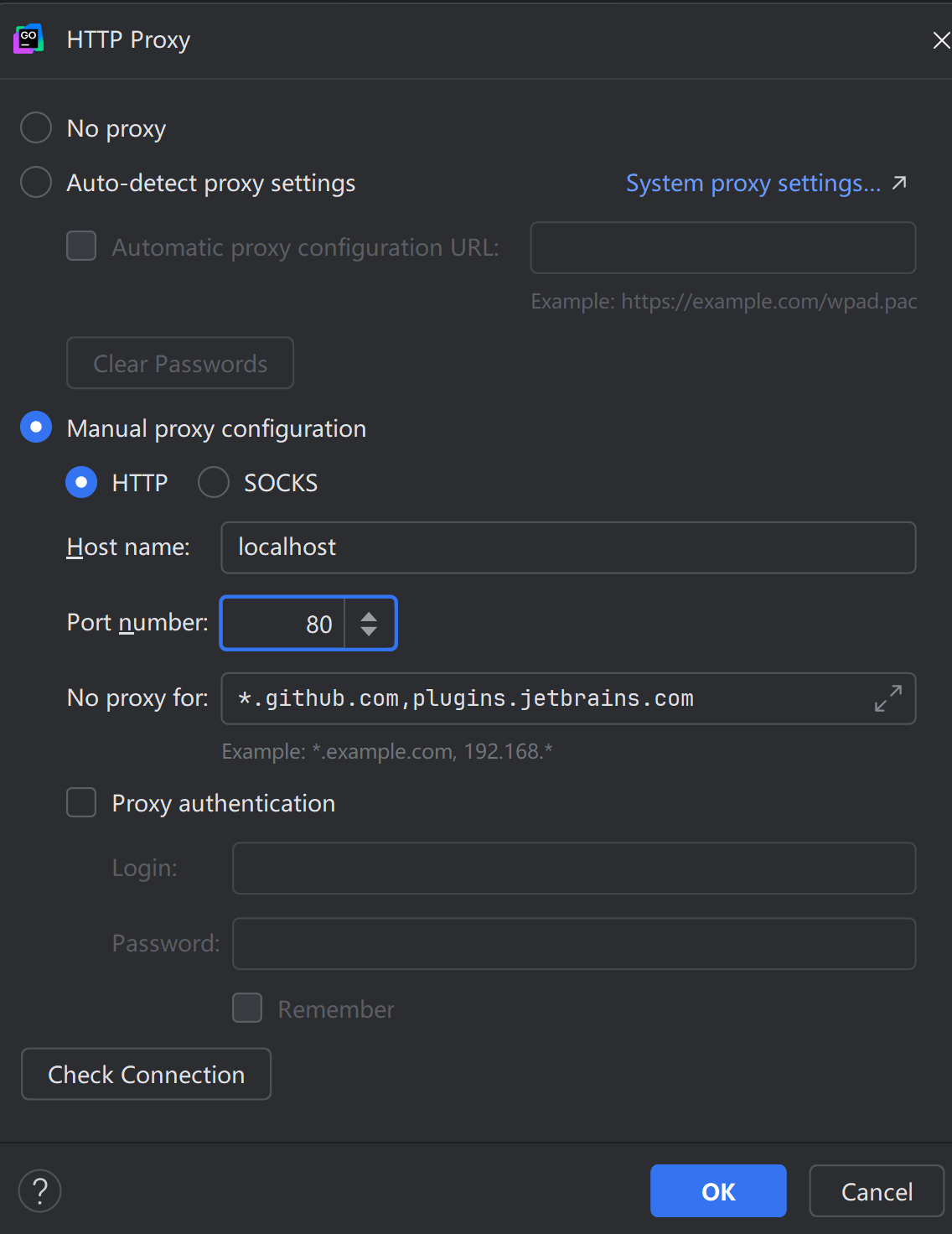 选择手动代理配置->HTTP,主机名localhost, 端口号80, 以下项目不用代理: *.github.com,plugins.jetbrains.com 确定
