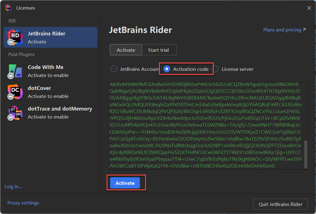 打开JetBrains Rider 2024软件,点击Activate paid license进入激活页面。将注册激活码复制到下图激活页面,击Activave即可激活使用。不用在意激活的时间,已经永久激活。