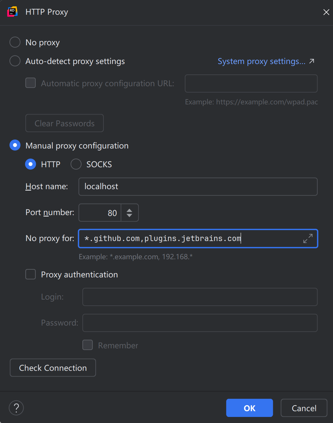 选择手动代理配置->HTTP,主机名localhost, 端口号80, 以下项目不用代理: *.github.com,plugins.jetbrains.com 确定