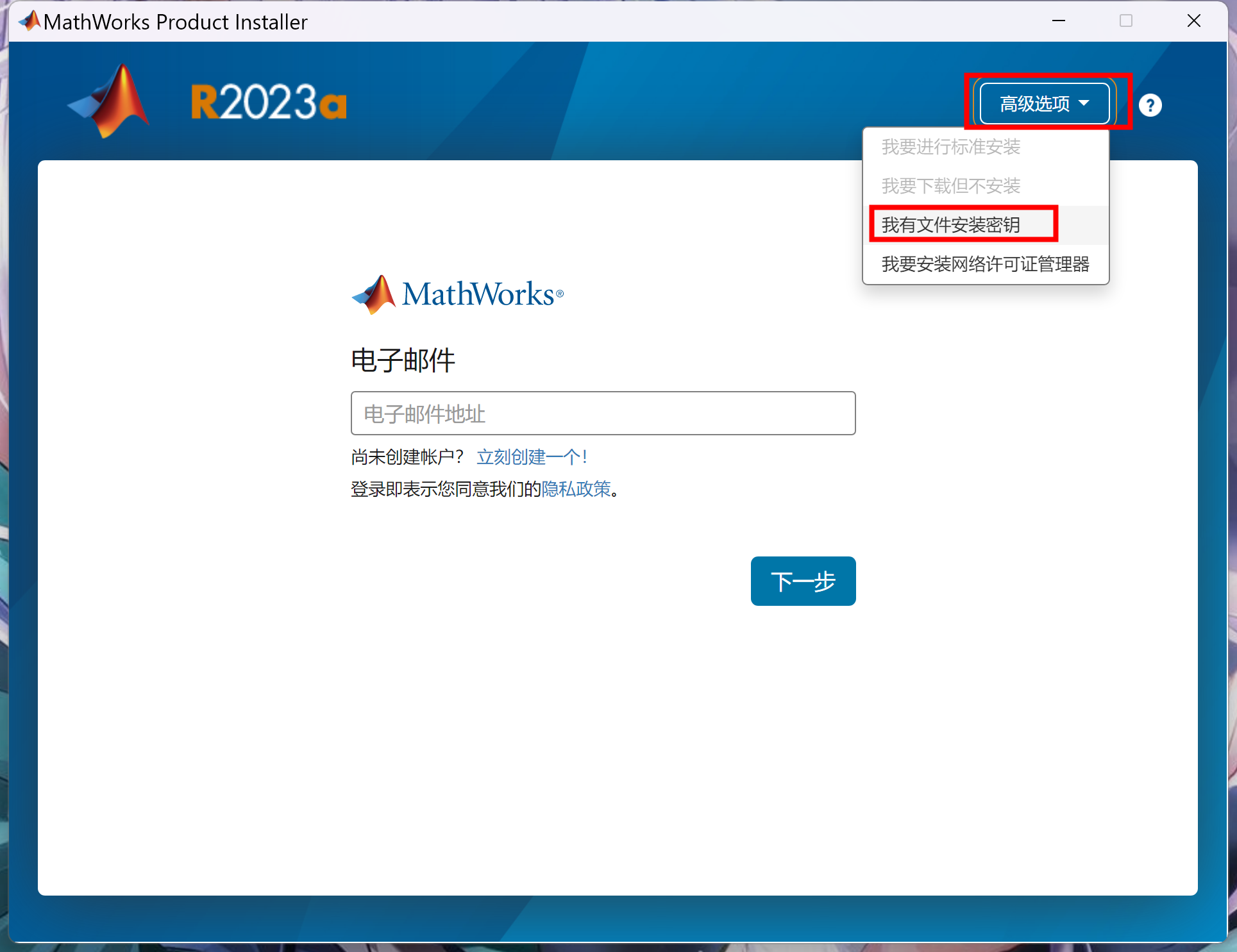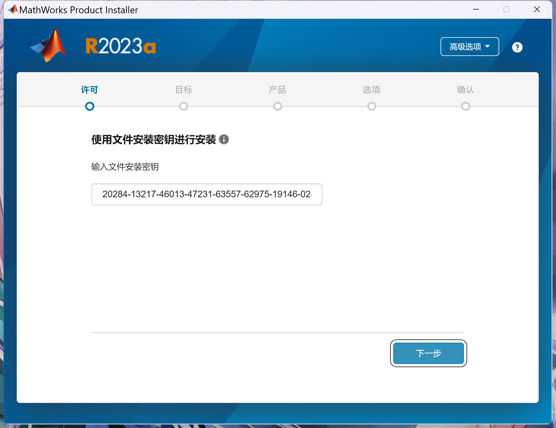 2、点击右上角高级选项,选择我有文件安装密钥。