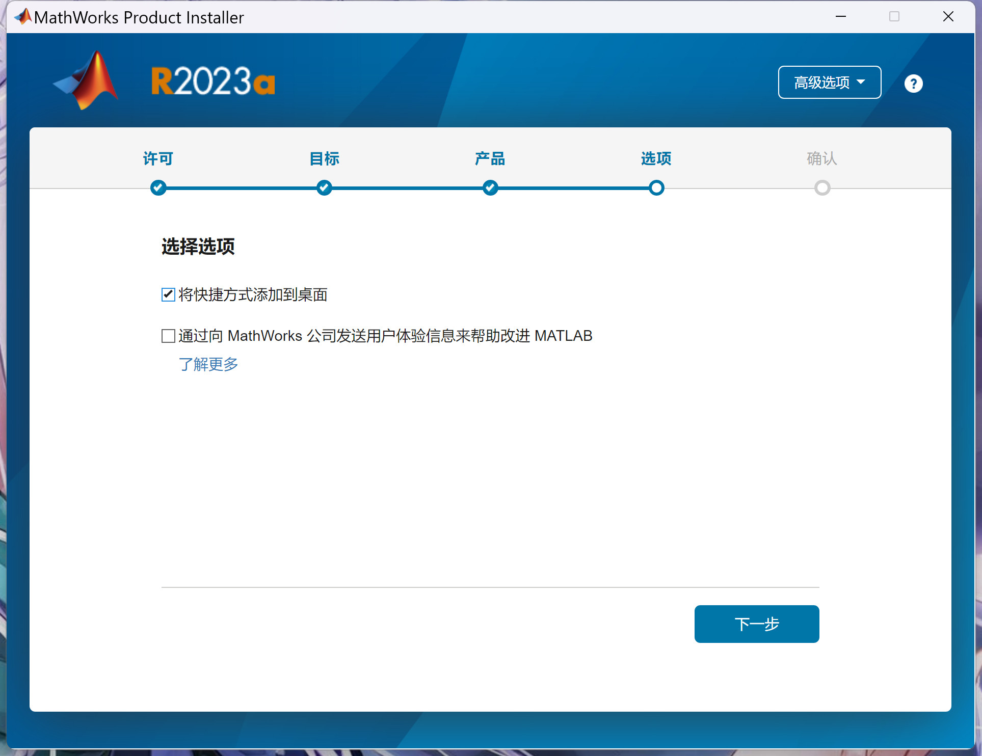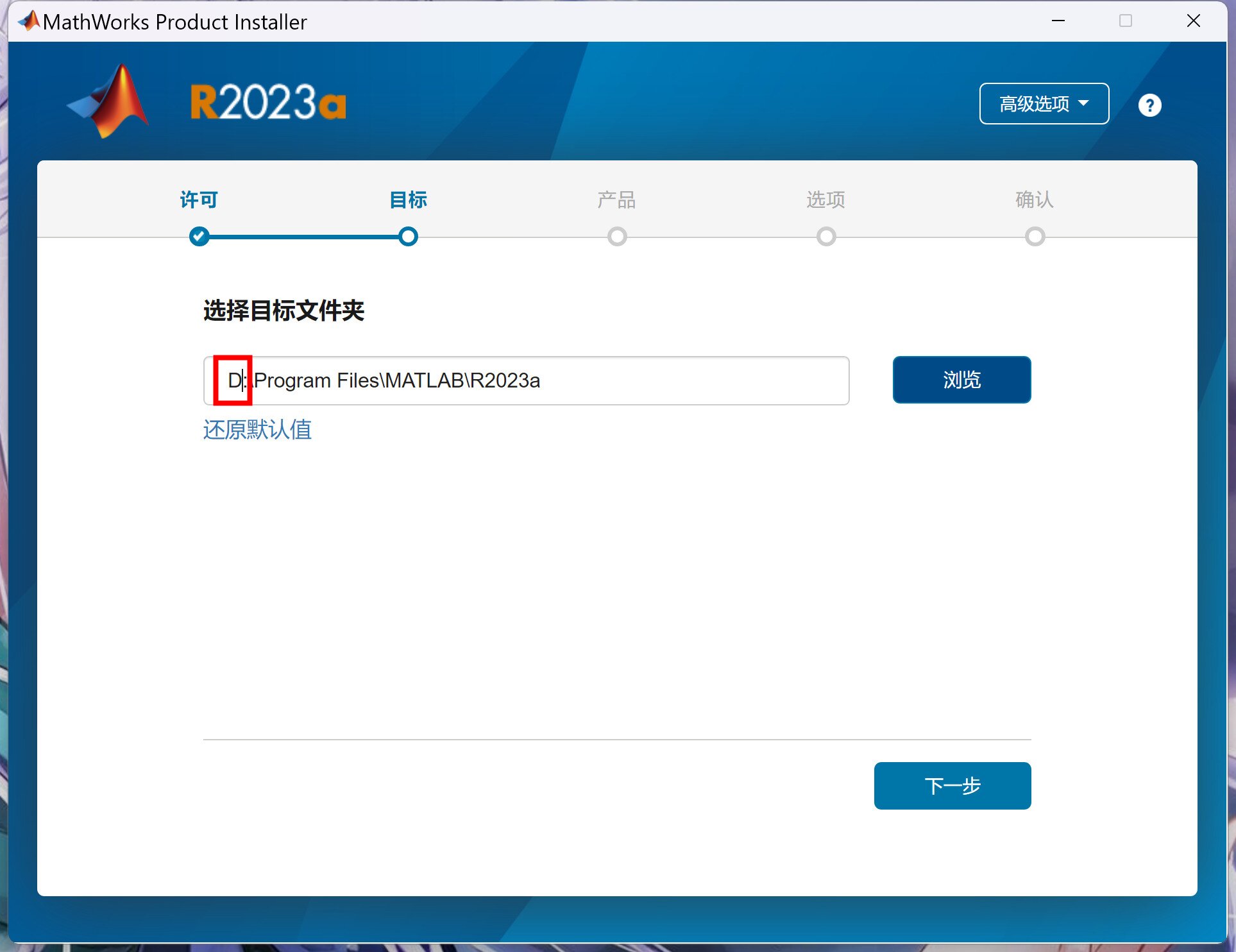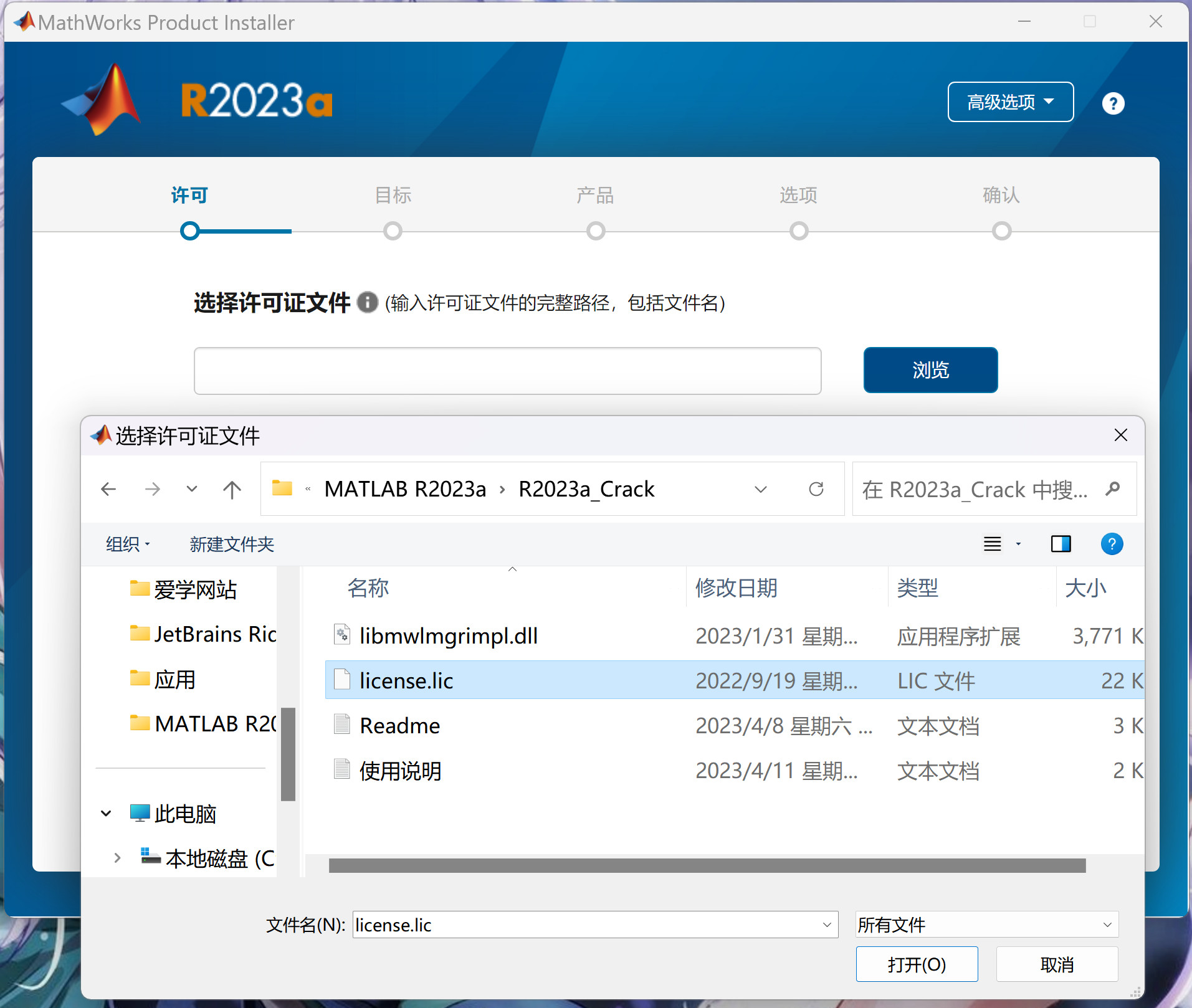 5、点击浏览,找到解压后的安装包里R2023a_Crack文件夹路径,选中license.lic文件,点击打开,点击下一步(路径不要有中文) 。