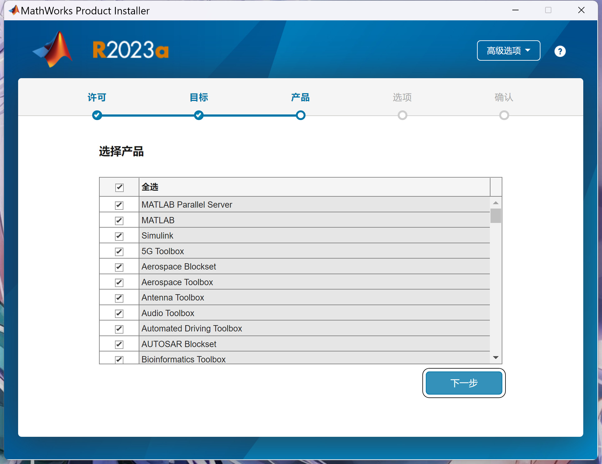 7、根据需要选择安装产品(默认全选),点击下一步。