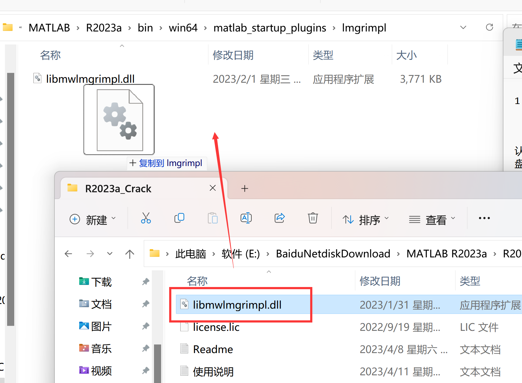 10、将安装包里面R2023a_Crack文件下的 libmwlmgrimpl.dll 复制替换到Matlab安装目录lmgrimpl文件夹内(安装盘:\Matlab\R2023a\bin\win64\matlab_startup_plugins\lmgrimpl)