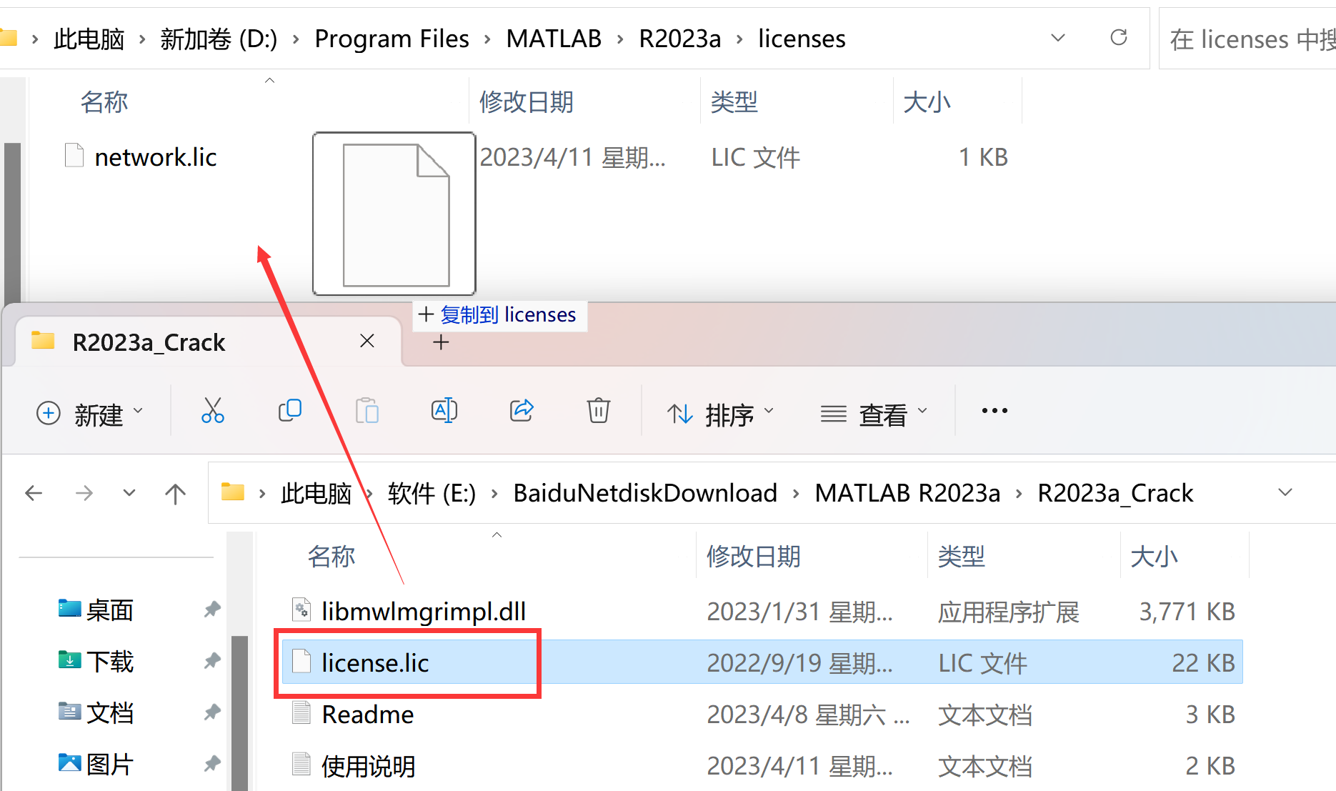 11、再把安装包里面R2023a_Crack文件下的 license.lic 复制替换到Matlab安装目录licenses文件夹内(安装盘:\Matlab\R2023a\licenses)