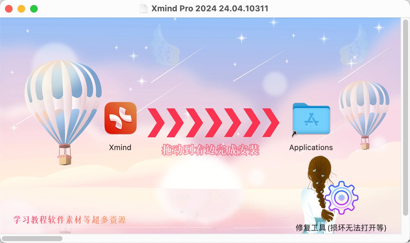 Xmind 安装包下载完成后,拖动左侧的Xmind 到右侧即可