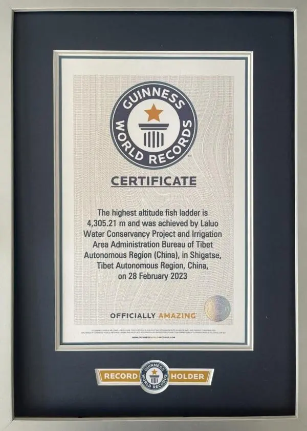 近日,由长江设计集团勘察设计的西藏拉洛水利枢纽工程鱼道获“最高海拔的鱼道”吉尼斯世界纪录,确认海拔为4305.21米。