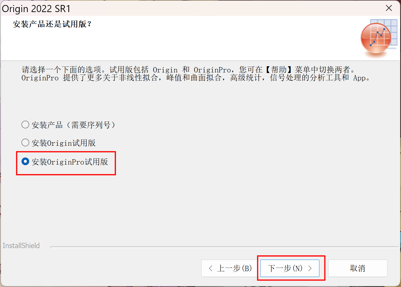 2、选择安装OriginPro试用版,点击下一步,再点确定(注意:如果提示试用期已结束,调整系统时间为2022年后再次安装,安装完成后时间改回即可)。