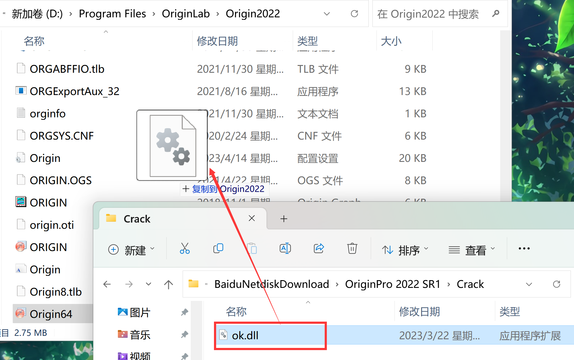10、返回安装包,复制安装包内Crack文件夹中的ok.dll到上面打开的软件安装目录文件夹中,点击替换。