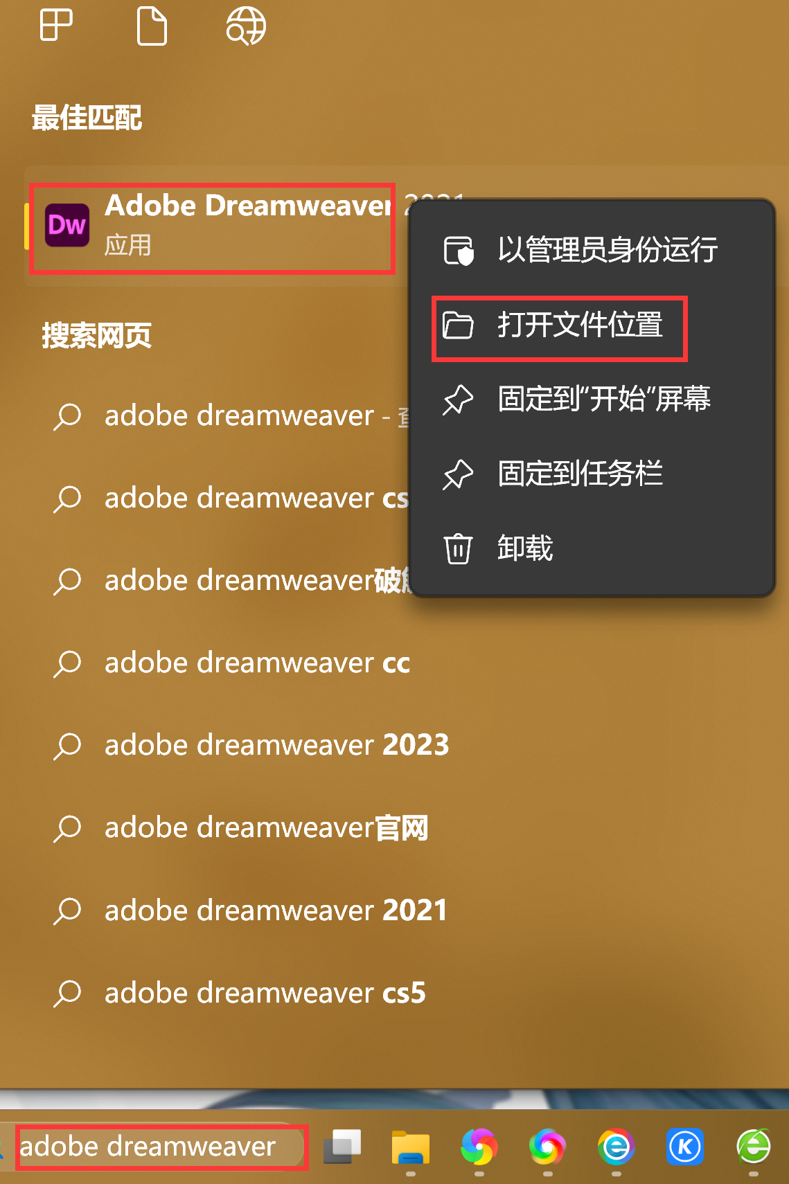 为了使用方便可以创建桌面快捷方式(右下角开始搜索Adobe Dreamweaver右键打开文件位置,将图标复制到做面即可)