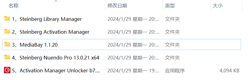 依次安装Steinberg Library Manager、Steinberg Activation Manager、MediaBay、Steinberg Nuendo Pro,最后安装Activation Manager Unlocker.exe