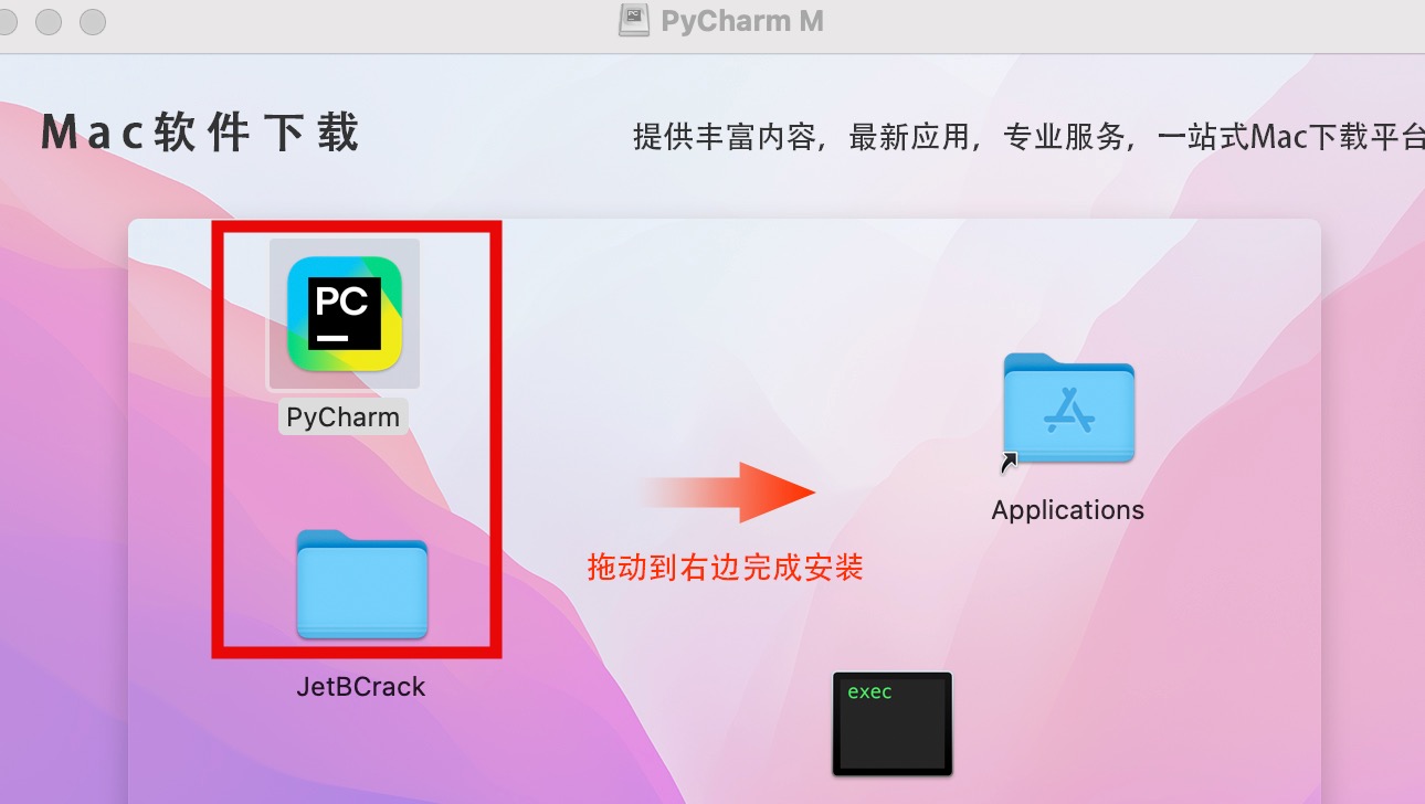 打开下载好的软件包,拖动Pycharm和JetBCrack文件夹到右边的文件夹中进行安装