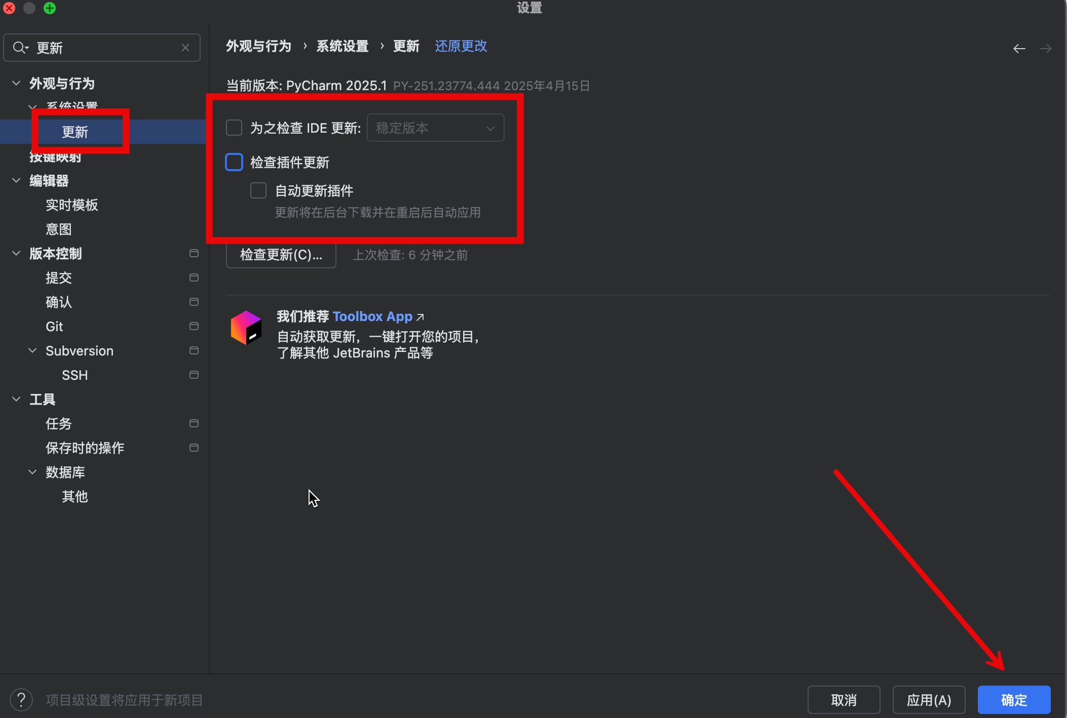 左上角的搜索框处输入更新,取消勾选右侧的自动检测更新,然后点击确定