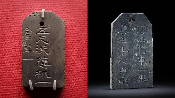 右:洛阳西朱村曹魏大墓出土的刻铭石牌。洛阳市文物考古研究院供图