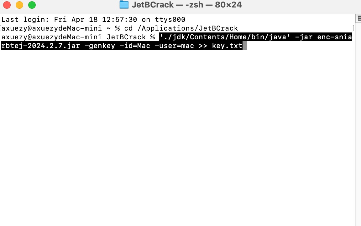 2025.1.3版本复制'./jdk/Contents/Home/bin/java' -jar sniarbtej-2024.2.8.jar -genkey -id=Mac -user=mac >> key.txt后回车