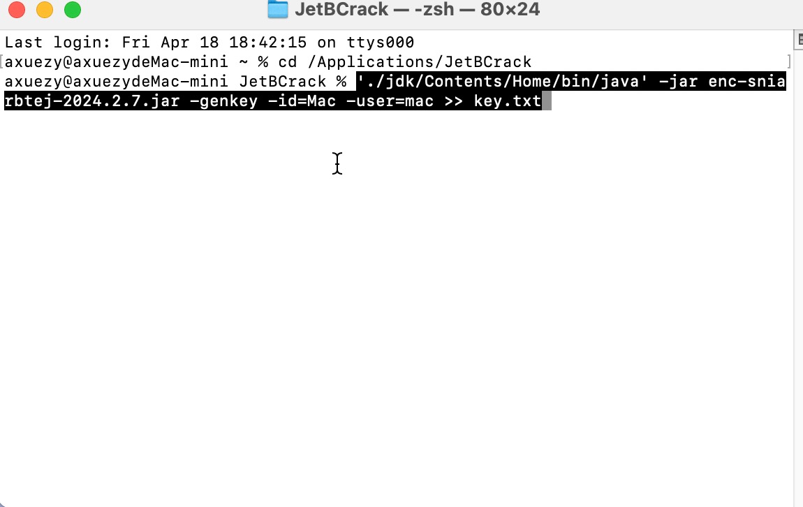 然后复制’./jdk/Contents/Home/bin/java’ -jar enc-sniarbtej-2024.2.7.jar -genkey -id=Mac -user=mac >> key.txt后回车