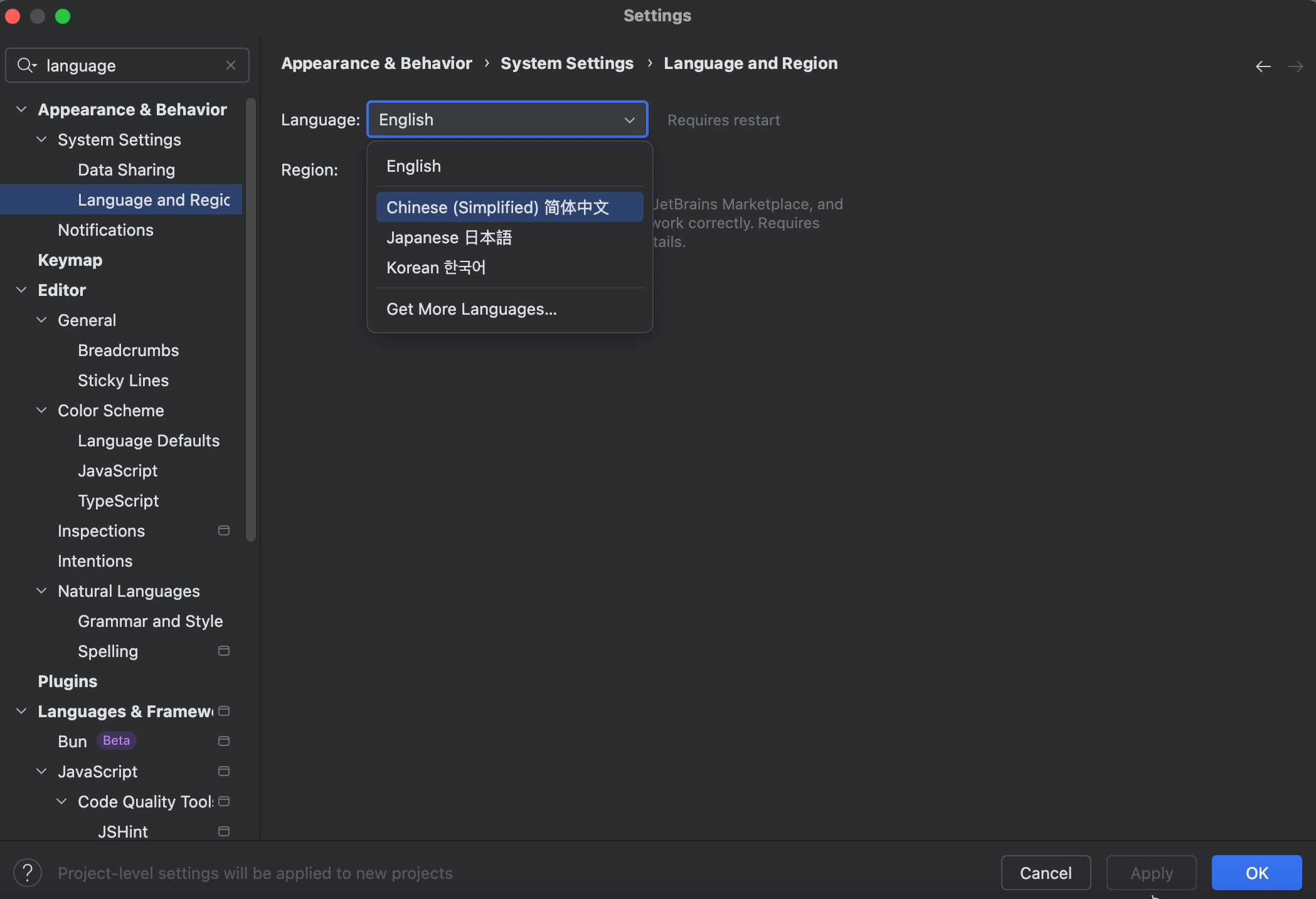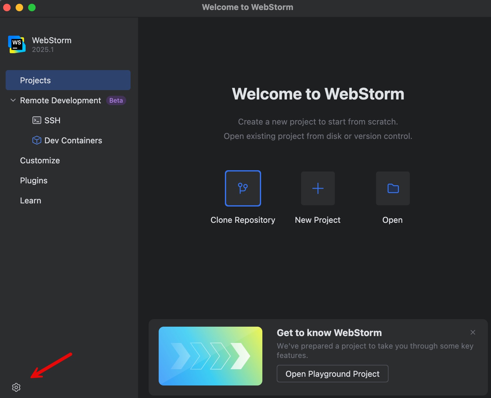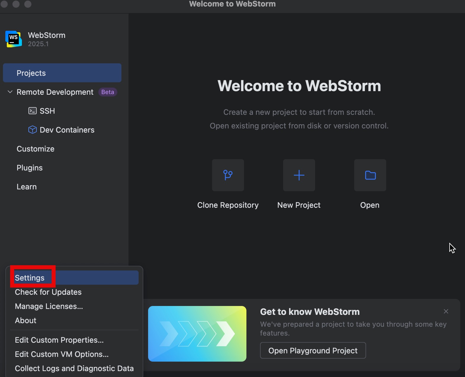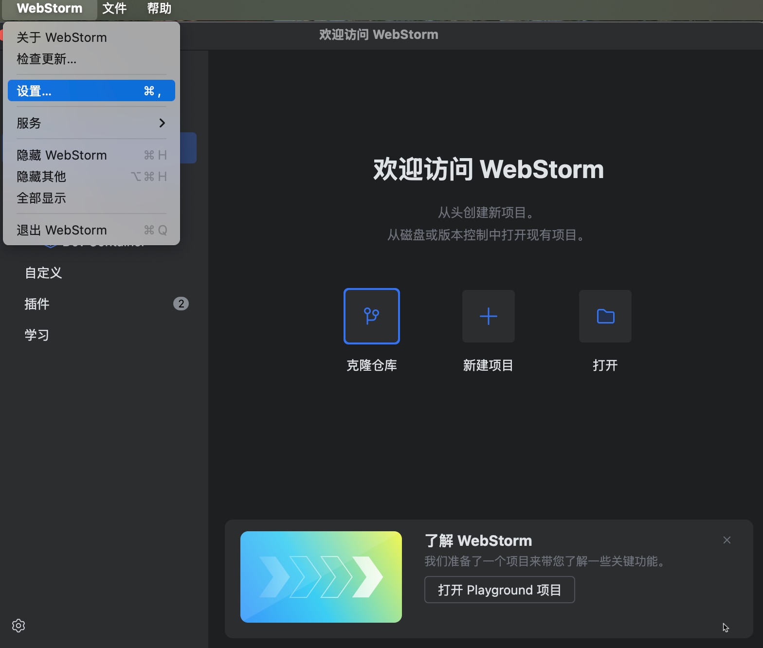 点击菜单栏的WebStorm,再点击settings…打开软件的偏好设置